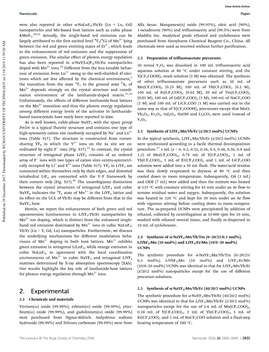2.4alpha;-NaYF4的合成:Mn / Yb / Tm(0-20 / 25 / 0.5mol%),LiYbF4:Mn(10mol%)和LiYF4:Er / Mn(10 / 0-20mol%)UCNPs