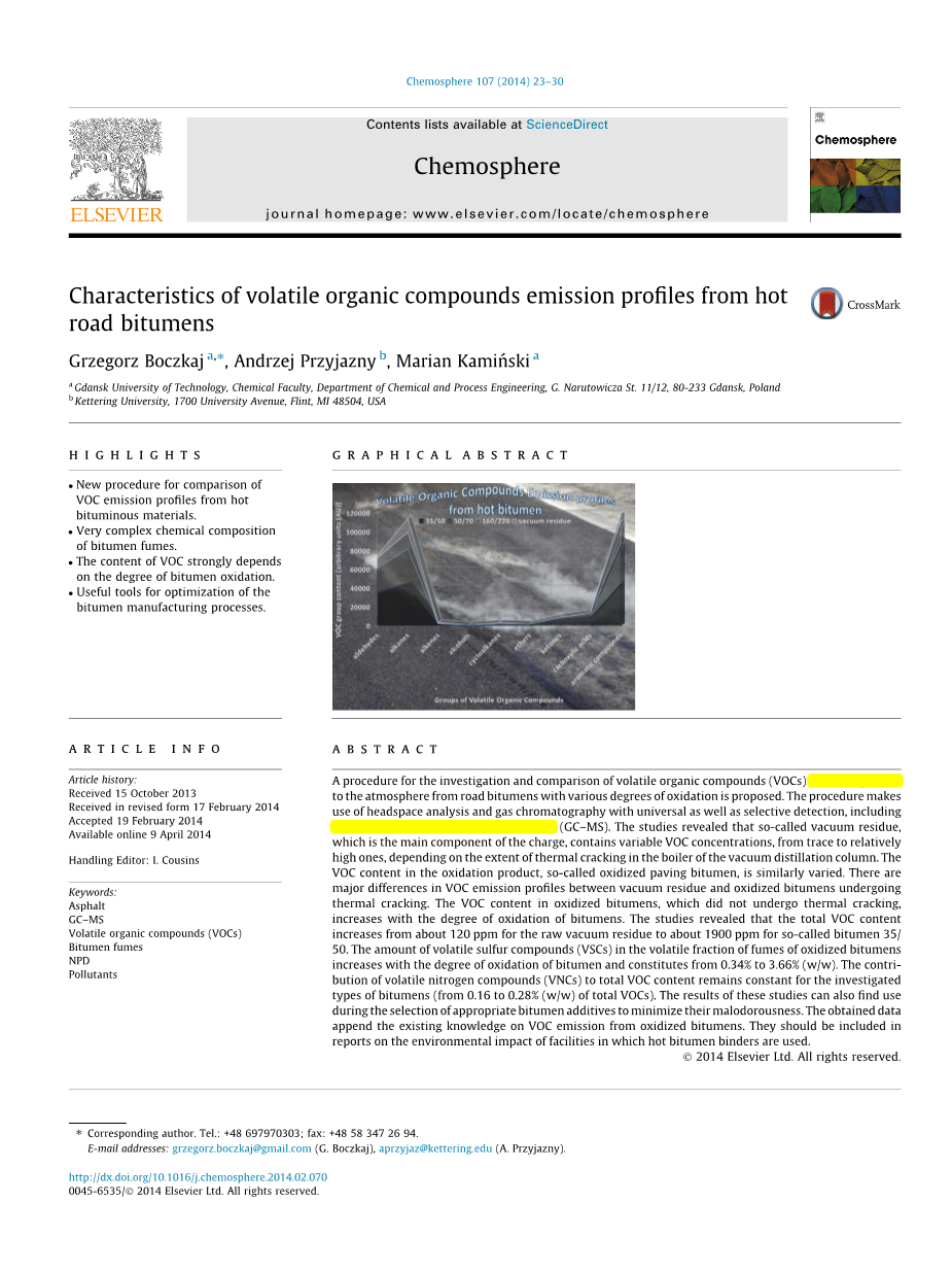 沥青粘合剂中挥发性有机化合物的出现造成严重的技术和环境问题,从其在生产过程中形成的时刻开始直到在道路铺设和其他应用中使用。已报告超过250个沥青应用实例(Whiteoak,2003)。 在大多数情况下,沥青必须在使用前加热以降低其粘度从而使其能够应用。沥青的生产涉及从石油的真空蒸馏中氧化残余物以获得具有所需性质的产物。在生产沥青原料(真空蒸馏)的操作以及用热空气氧化的过程中,沉积在加热元件上的沥青质量经历部分热裂解,这导致不饱和芳香族化合物以及氢气、硫化物、水蒸气、羰基硫化物、碳二硫化物等的形成。这些化合物经历进一步的转化,产生各种挥发性化合物:酮,醛,有机酸,酚及其衍生物,以及有机硫和有机氮化合物。在反应器中用热空气除去一部分所得的挥发性化合物,产生所谓的废气,其在碱性水溶液中进行洗涤或在洗油中吸收(Boczkaj等,2010,2014)。沥青中残留的VOC在储存期间排放(Deygout,2011; Davie等, 1993a, 1993b, Trumbore, 1999),运输(EPA,2000a),制作矿物沥青混合物(EPA,2000b; Ventura等,2007; Ruehl等,2007; Gasthauer 等人,2008; Chauhan等, 2010; Jullien等,2010),屋顶浸渍(Rogge等,1997; Trumbore,1998; Franzen和Trumbore, 2000; Kriech等, 2004; Ruehl等,2007; Parker等,2011)和铺路(Brandt等, 1985; Monarca等, 1987; Greenspan等, 1995; Hicks, 1995; Gamble等, 1999; Burstyn和 Kromhout, 2000; Burstyn 等, 2003;Posniak, 2005; Preiss等, 2006; Hugener等, 2010; Breuer等, 2011; Spickenheuer等, 2011; Raulf-Heimsoth等,2011).