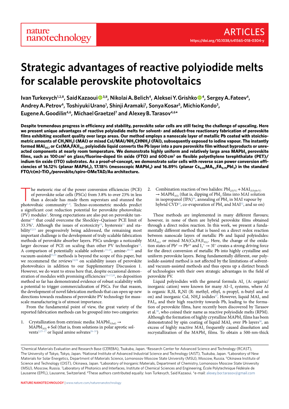Ivan Turkevych1,2,8, Said Kazaoui 3,8, Nikolai A. Belich4, Aleksei Y. Grishko 4, Sergey A. Fateev4,Andrey A. Petrov4, Toshiyuki Urano1, Shinji Aramaki1, Sonya Kosar5, Michio Kondo3,Eugene A. Goodilin4,6, Michael Graetzel7 and Alexey B. Tarasov4,6*