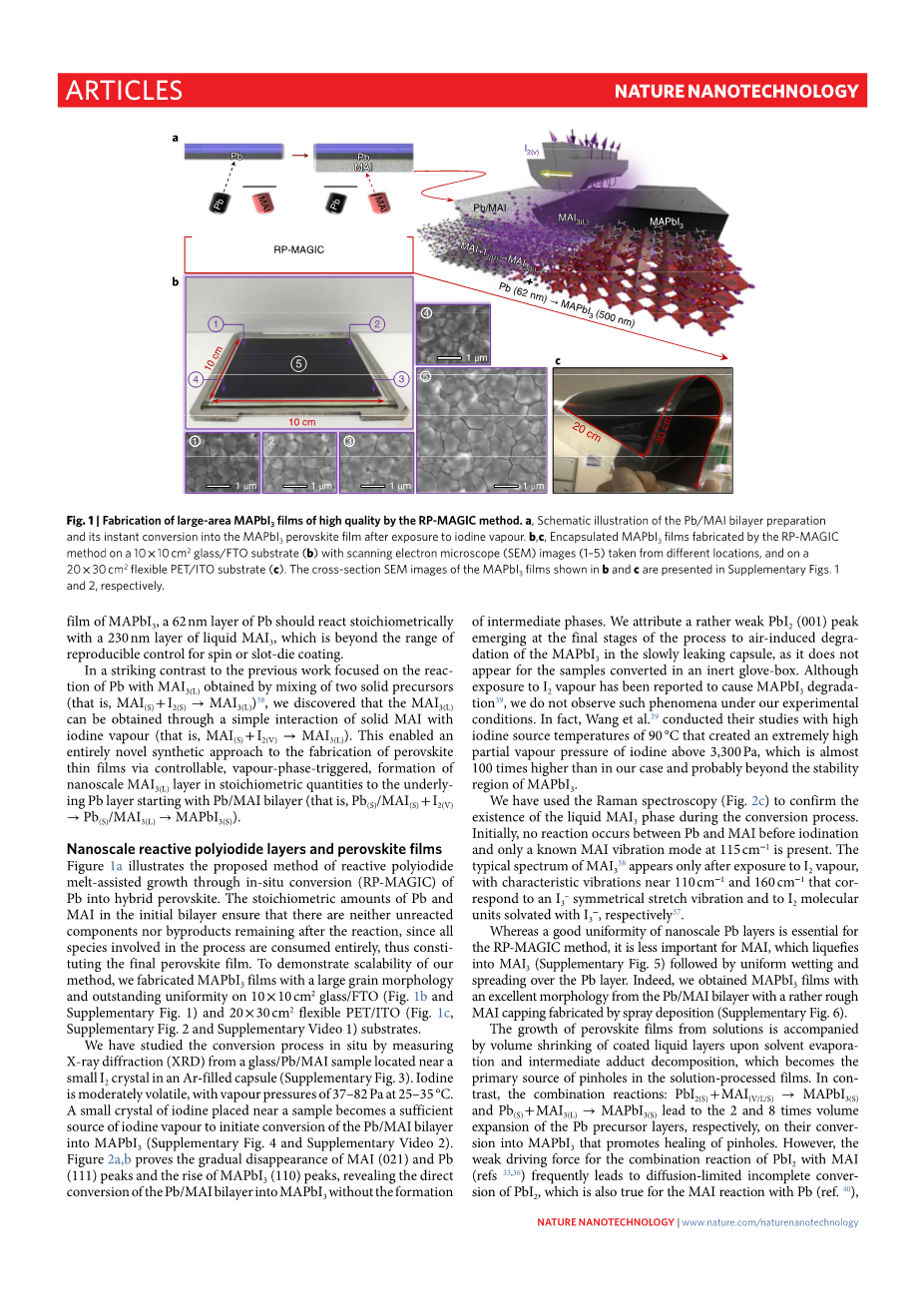 图1a说明了将Pb原位转化(RP-MAGIC)为钙钛矿的活性聚碘化物熔融辅助生长方法。在初始双层中Pb和MAI的化学计量保证了反应后既没有未反应组分也没有副产物残留,因为过程中涉及的所有种类都被完全消耗掉了,从而构成了最终的钙钛矿薄膜。为了证明我们的方法的可规模化,我们制备的MAPbI3薄膜在10times;10cm2玻璃/ FTO(图1 b和补充图1)和20times;30cm2柔性的PET / ITO(图2和图1 c,补充补充视频1)基板上有一个很大的颗粒形态和杰出的一致性。