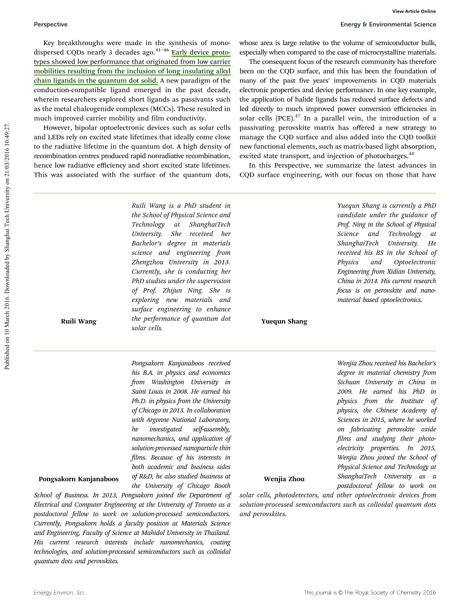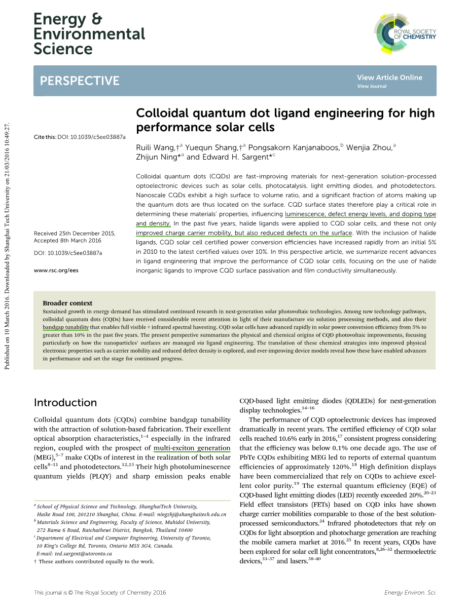 延伸内容:能源需求的持续增长刺激了对下一代太阳能光伏技术的研究。 在这些新技术中,胶体量子点(CQD)由于其通过溶液处理方法制造在近期受到广泛关注,并且它们的带隙可调性使它能够实现完全可见 红外光谱采集。 在过去的五年中,CQD太阳能电池的太阳能转换效率从5%迅速提高到10%以上。 目前的文章总结了CQD光伏改进的物理和化学起源,特别关注如何通过配体工程控制纳米颗粒的表面。通过这些化学过程来改进器件的物理电子特性,例如载流子迁移率和降低缺陷密度。并且不断改进的器件模型揭示了它们如何促进性能的进步并为持续进步创造了条件。