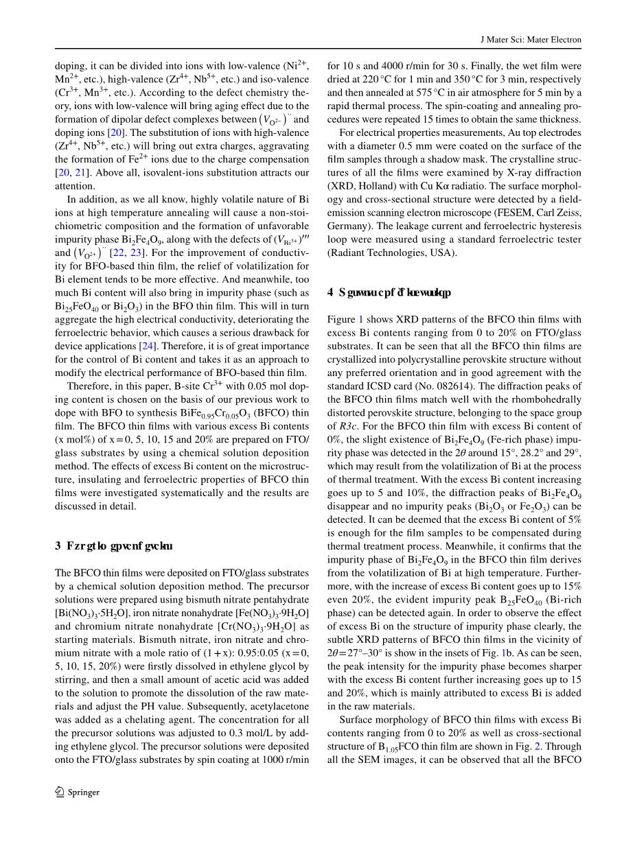 从细节上说,Bi过量0%和5%的漏电电流密度分别为2.24times;10-5和3.04times;10-5A/cm2,这些数据均是在电场强度为200kV/cm的条件下得到的。与此同时,关于为什么测得的漏电电流密度0%的要低于5%的这一问题,可能是因为Bi2Fe4O9这一不利相的导电率低于BiFeO3。此外,随着Bi的过量程度达到10%,电流密度数据得出来是1.39times;10-5A/cm2,低于0%和5%的样品。基于这一现象,我们推测(VBi3 )··· 和(VO2 )··都因为过量的Bi的存在被有效地减少。我们知道,(VBi3 )··· 和(VO2 )··sdot;sdot;是由于在高温下Bi的挥发过程中产生的,其反应方程式是