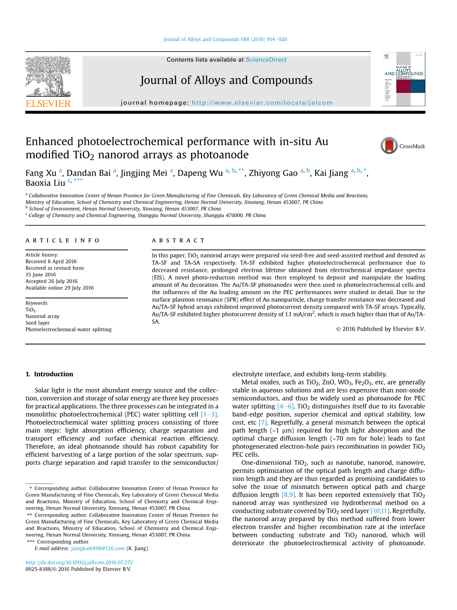 摘要: 在这篇文章中,TiO2纳米阵列通过自由生长和协助生长两种方式制成并且标记为TA-SF和TA-SA。 TA-SF展示了较高的光电性能由于低的电阻,和电化学阻抗能谱(EIS)延长的电子寿命. 一种新奇的减少光子的方法从而被利用去沉积和操作金修饰的负载量。Au/TA-SF光电阳极也因此用于光电电池中,同时金负载所影响的PEC性能也在本文中详细研究。由于表面等离子共振(SPR)对于金纳米粒子的影响,电子转移的抗性降低了,同时Au/TA-SF杂化阵列相比于TA-SF展示了优良的光电流密度。更特别的是,Au-TA-SF展示了1.1mA/cm2的高电流密度,比Au/TA-SA的更高。