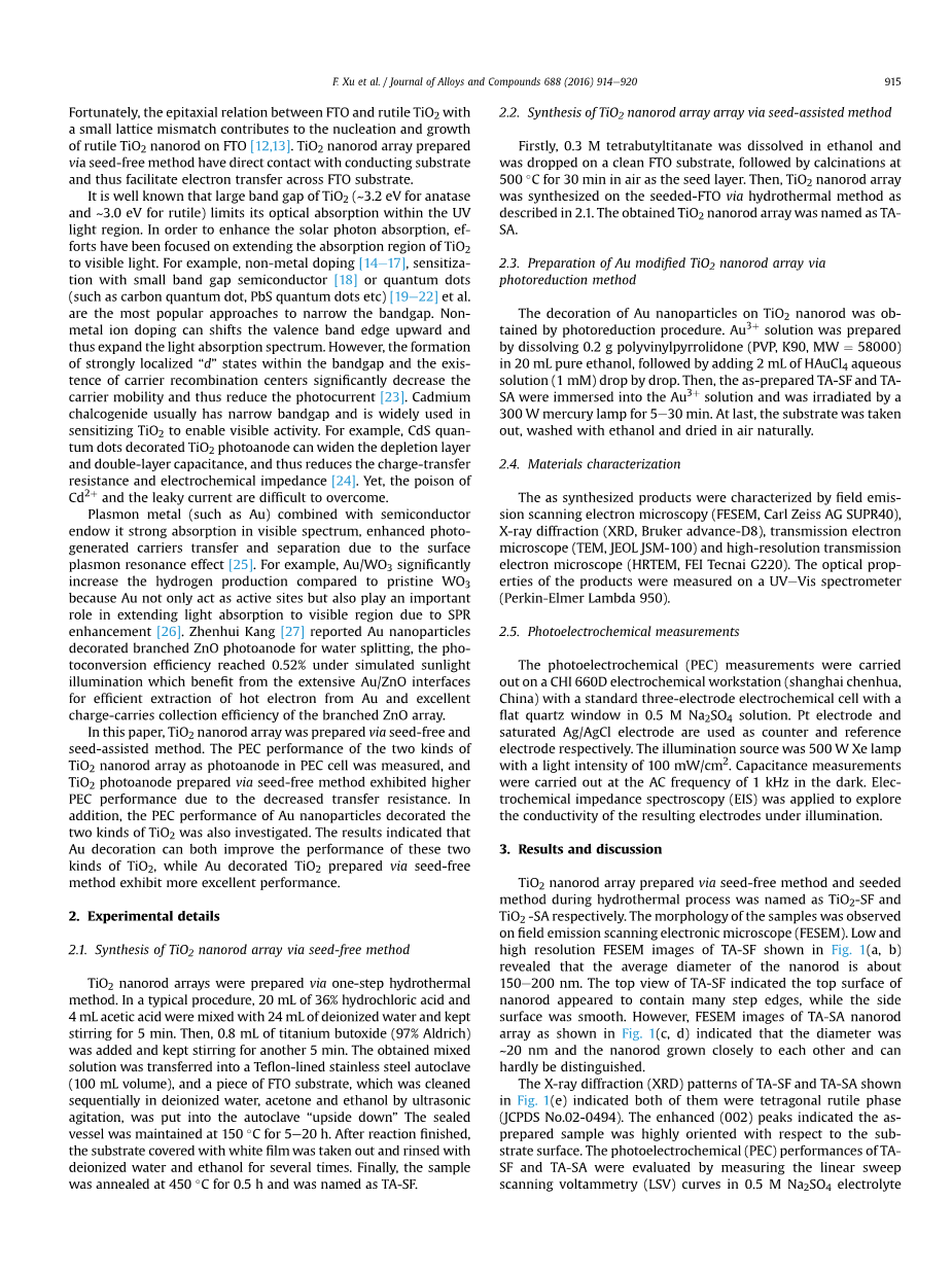 显示TA-SF和TA-SA的X射线衍射(XRD)图谱在图1中。 如图1(e)所示,它们都是四方金红石相(JCPDS No.02-0494)。 增强的(002)峰表明,准备准备的样品相对于基底表面高度取向。 通过测量线性扫描评估TASF和TA-SA的光电化学(PEC)性能在0.5M Na2SO4电解质中扫描伏安法(LSV)曲线徐旭等 /合金和化合物杂志688(2016)914e920 915在模拟太阳辐射(AM 1.5 G,100 mW cm-2)电势范围在0.2 V至1.5 V之间,与Ag / AgCl相关。如图1(f)所示,两个光电二极管在黑暗中的电流密度为非常低,而在照明下两者的电流密度光阳极特别是在潜在的结果中显着增加0.3 V对Ag / AgCl。 此外,通过无籽法制备的TiO2纳米棒阵列在整个电位范围内显示比种子更高的光电流密度。