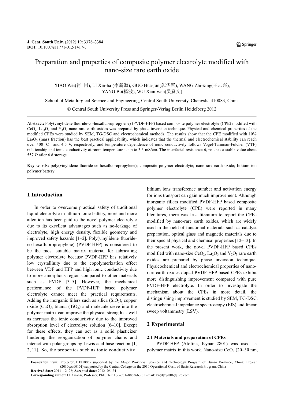 关键字:聚偏氟乙烯-六氟丙烯;复合聚合物电解质;纳米稀土氧化物;锂离子聚合物电池·