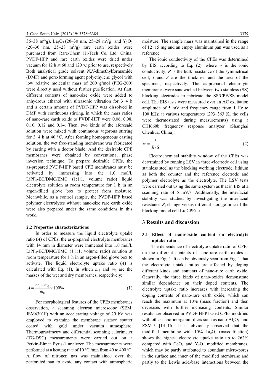 图1显示了CPE的电解质吸收率对不同含量的纳米稀土氧化物的依赖关系。从图1中可以明显看出,掺杂不同种类和含量的纳米稀土元素会影响电解质吸收率, 稀土氧化物。 一般来说,这三种纳米氧化物对它们的掺杂含量表现出相似的依赖性。随着纳米稀土氧化物掺杂量的增加,电解质吸收率增加,当掺杂量达到10%(质量分数)时达到最大值,随着含量的进一步增加而降低。在用其他纳米无机填料如纳米Al2O3和ZSM-5改性的基于PVDF-HFP的CPE中观察到类似的结果[14-16]。 很显然,与CeO2和Y2O3改性的膜相比,具有10%La2O3(质量分数)的改性膜显示最高的电解质吸收率高达262%,这可能部分归因于表面和内部的丰富的微孔 改性膜,部分是由于纳米稀土氧化物和聚合物基体之间的路易斯酸碱相互作用。 在下面的实验中提出的更详细的研究是研究用10%纳米氧化物改性的基于PVDF-HFP的CPE的实际性能。
