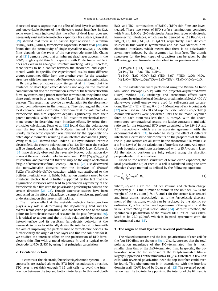 金属-铁电异质结的界面效应在确定去极化场和整体铁电极化方面起着关键作用,近年来已成为铁电材料研究的热点之一[29]。为了人为地设计界面结构,以提高铁电器件的性能,理解异质界面及其在纳米尺度上产生的铁电行为之间的内在关系是至关重要的。为了进一步阐明死层的成因并找到解决办法,我们利用第一性原理计算研究了金属电极铂和典型氧化物电极LaNiO3(LNO)对BTO铁电薄膜极化的界面效应。