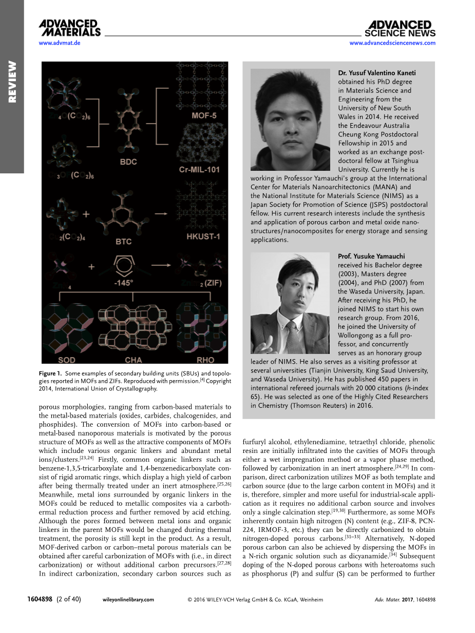 20世纪90年代后期金属有机框架(MOF)的发现是一个突破,因其高度可调的成分、结构和气孔尺寸获得了巨大的关注。[1]MOF或多孔配位聚合物(PCPs)首先被定义为一类晶体多孔材料,由金属离子或团簇(或二级结构单元(SBUs))通过有机连接体或配位体之间的强配位键连接在一起。[2]MOF中的有机连接体主图1一些在MOF和ZIFs报告中二级建筑单元(SBUs)和拓扑的例子。[4]允许复制。2014年版权,国际晶体学联合会。
