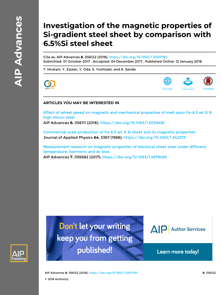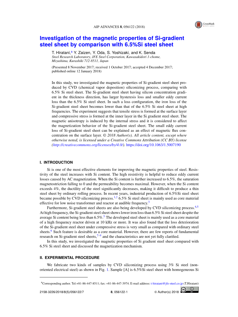 通过提供Si浓度分布。在高磁场中,Si分布的影响没有被观察到。硅梯度钢板与6.5%硅梯度钢板之间存在着简单的损耗关系。低频侧为6.5%的si钢片铁损较低,高频侧为si梯度钢片铁损较低。边界的频率由损耗系数决定。