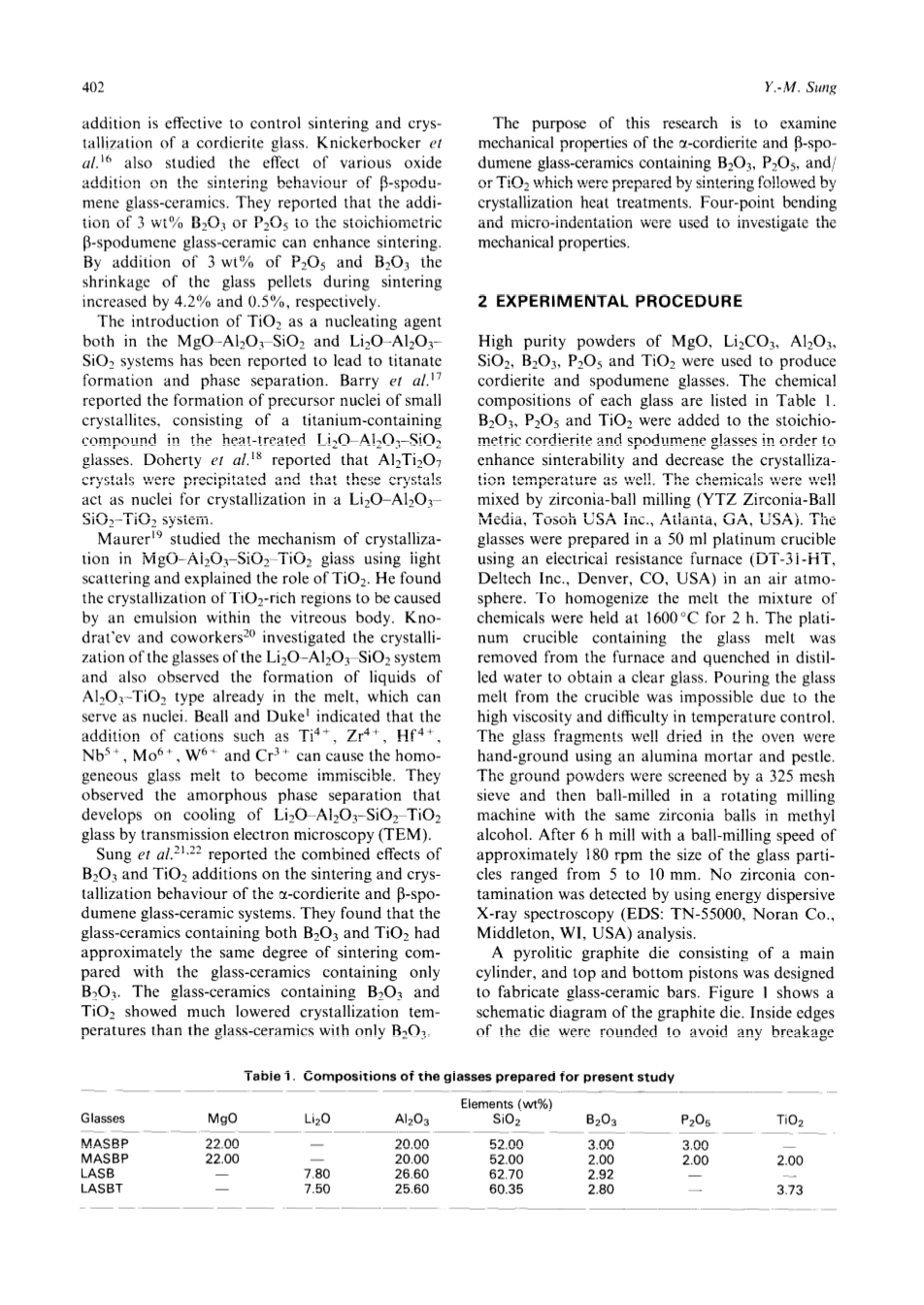 本研究的目的在于用四点弯曲和微压痕法检测并研究通过烧结然后结晶热处理制备的含有B2O3,P2O5或许含有TiO2的alpha;-堇青石和beta;-锂辉石微晶玻璃的机械性能。