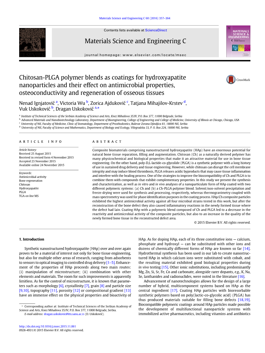 摘要:一直以来,与纳米羟基磷灰石结合的生物复合材料在天然骨组织再生、填充和增强方面有很大的前景。而壳聚糖作为天然聚合物衍生物拥有许多理化性质,这些性质使它在骨组织工程领域备受关注,同时,聚乳酸-羟基乙醇酸更是一种早期发现的用于药物缓释和组织工程的合成高分子聚合物,然而,壳聚糖能够破坏细胞膜的完整性,可能会导致血栓的形成。聚乳酸-羟基乙醇酸释放酸性副产物,可能引起组织炎症,影响干扰愈合过程。提高壳聚糖和聚乳酸-羟基乙醇酸的生物相容性的一种方法是将两者结合达到互补的目的。本次研究中我们提供了合成与表征方法,研究了体内体外环境中壳聚糖和壳聚糖/聚乳酸-羟基乙醇酸两种体系包覆的羟基磷灰石纳米颗粒的特性。其中,合成和加工的方法是溶剂/非溶剂沉淀法冷冻干燥,并利用热分析质谱法在包覆过程中进行了相分析。实验结果显示,壳聚糖/羟基磷灰石复合颗粒对四种试验用的微生物菌株表现出最高的抗菌性能,但在骨缺损重建之后,它们在缺陷处新形成的组织中也会引起炎症反应。聚乳酸-羟基乙醇酸包覆羟基磷灰石纳米颗粒不仅能减少复合微粒的反应性和抗菌活性,而且有利于在骨损伤区域获得更好的新生骨组织。