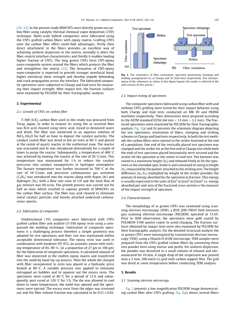 由具有和不具有CNTs接枝的碳纤维制造的复合材料样品分别用在MK 05和FRANK机器上进行简支梁和悬臂梁试验来测试它们的冲击性能。它们的尺寸根据ASTM标准D256(64mmtimes;12mmtimes;3.2mm)制备。利用场发射扫描电子显微镜观测其断面并进行断面分析。图1(a)和(b)分别为悬臂梁和简支梁试验中测试试样、纤维取向、夹紧方式和冲击方案的示意图。在这两种测试方法中,碳纤维垂直于摆锤末端处的锤头。在悬臂梁试验中,垂直放置的测试样品一端被夹紧,锤头撞击自由端;在简支梁试验中,水平放置的测试样品两端均被固定,锤头撞击样品中间。将锤头抬升到最大高度(h0)并自由释放来击打样品的指定位置使其破坏,锤头继续摆动至由摆臂尖端测量得到的高度(h1)。将高度差(h0-h1)乘以锤头重量得到试样断面的能量吸收值。这个能量通常用J/m2、J/cm2或J/mm2等单位表示,即断裂截面单位面积吸收的能量为该试样冲击强度的量度。