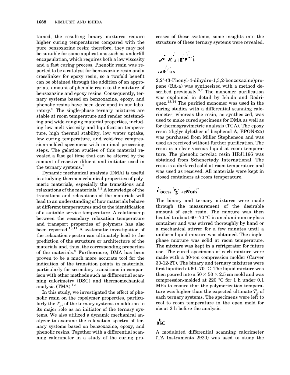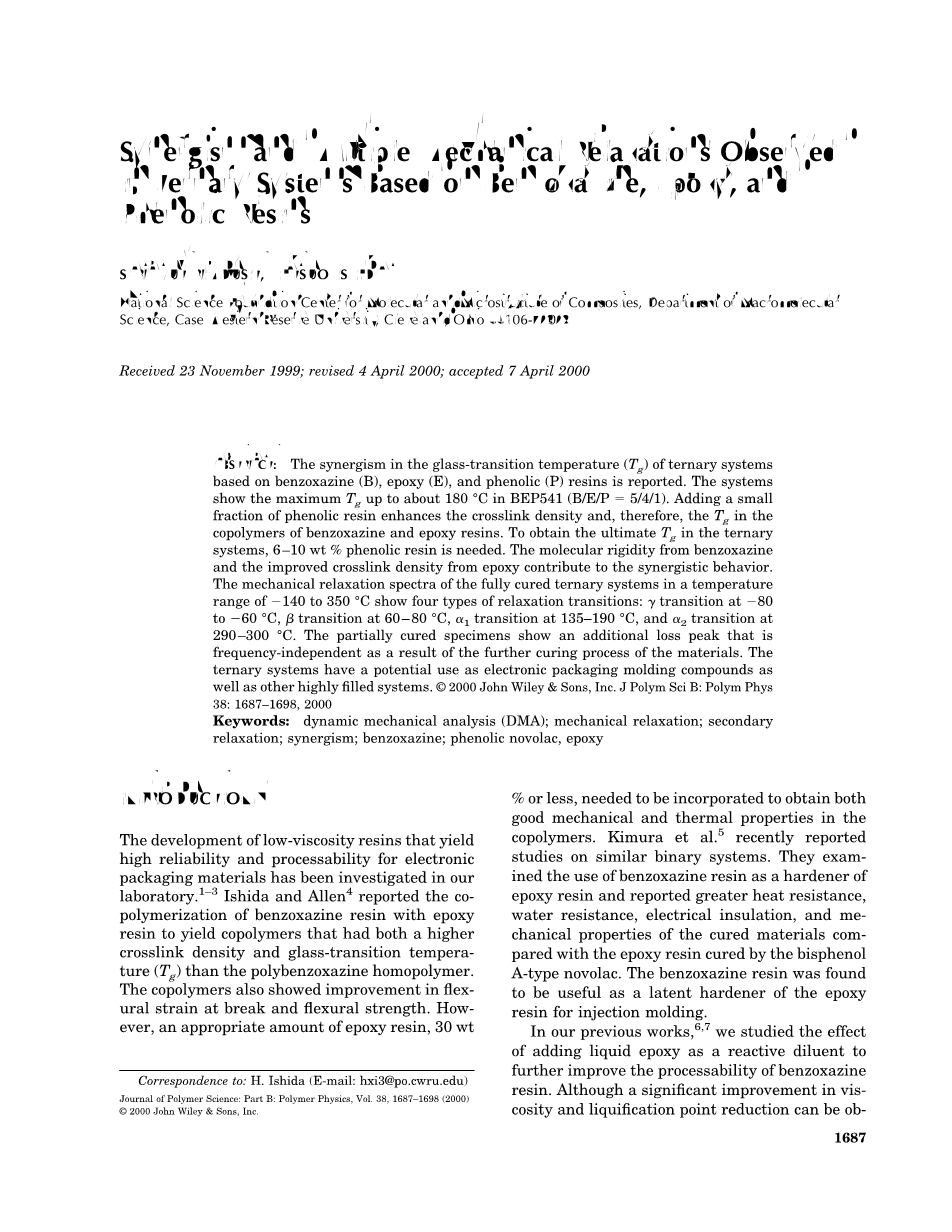 关键词 : 动态力学分析(DMA); 机械松弛;次要松弛;协同作用;苯并恶嗪; 酚醛清漆,环氧树脂