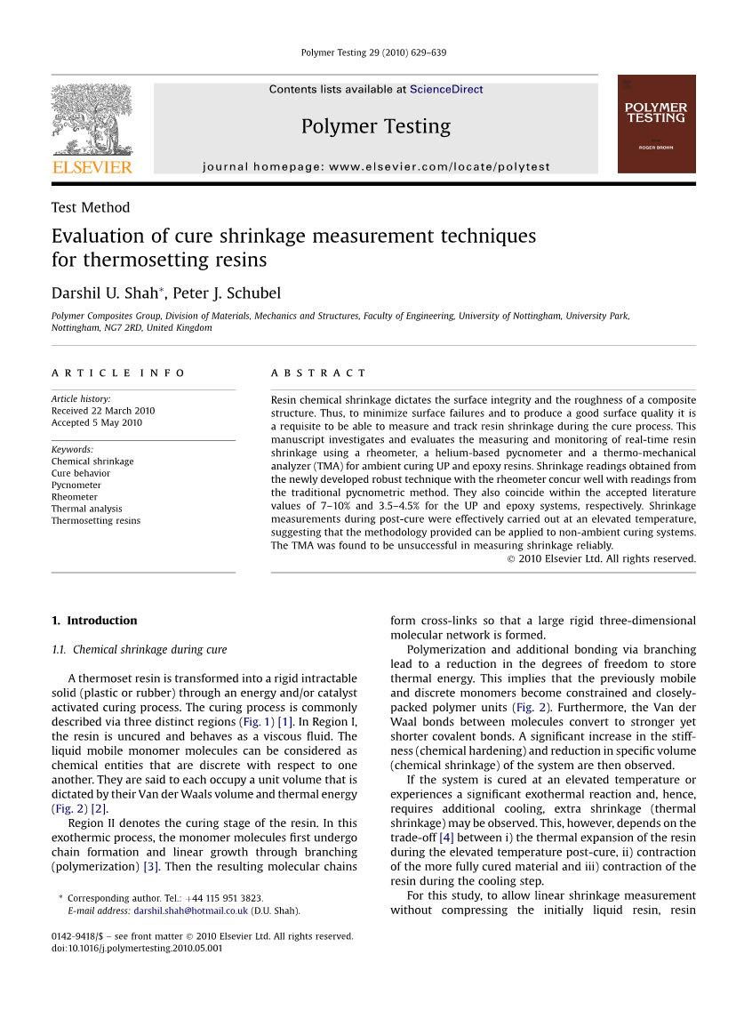 摘要:树脂化学收缩决定了复合结构的表面完整性和粗糙度。因此,为了减少表面失效并产生良好的表面质量,在固化过程中能够测量和跟踪树脂收缩率是必不可少的。该手稿使用流变仪,氦基比重瓶和热机械分析仪(TMA)对环境固化UP和环氧树脂进行实时树脂收缩的测量和监测。采用流变仪最新开发的鲁棒技术获得的收缩读数与传统比重法的读数一致。它们在UP和环氧树脂体系的公认文献值中也分别为7-10%和3.5-4.5%。后固化期间的收缩测量在高温下有效进行,表明所提供的方法可以应用于非环境固化体系。发现TMA不能可靠地测量收缩率。