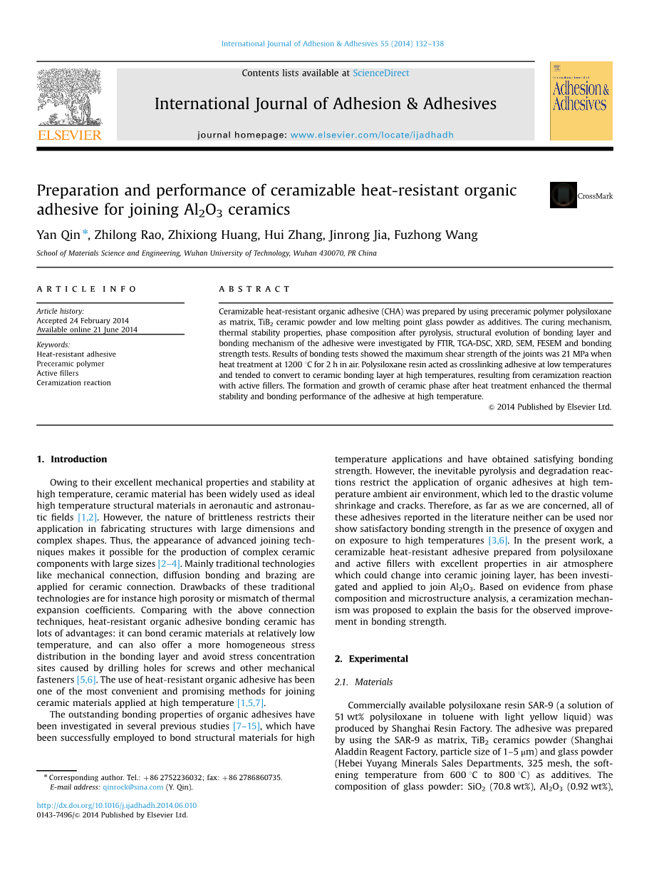 有机胶黏剂优异的粘结性能在先前已经得到了广泛的研究,目前已经成功的应用于高温结构材料的粘结,并且得到了较为满意的粘结强度。然而,有机胶黏剂不可避免的热解和降解反应,导致材料产生了严重的体积收缩和裂纹,从而限制了其在高温环境下的应用。因此,我们认为所有这些在文献中被报道的胶黏剂,当其在高温有氧的条件下,既不能使用也不能获得令人满意的粘结强度。本文研究了一种以聚氧硅烷和活性填料为原料,可以在空气中形成陶瓷粘结层的有机胶黏剂,并将其应用于Al2O3的连接中。本文基于相组成和微观形貌的分析提出了一种陶瓷化机理,用于解释所观察到的粘结强度提高的现象。