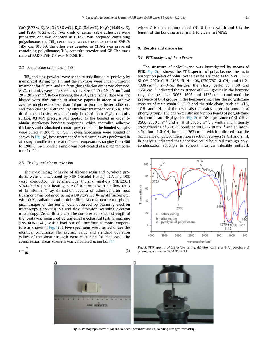 通过FTIR(Nicolet Nexus)表征有机硅树脂和热解产物的交联行为,TGA和DSC通过同步热分析(NETZSCH STA449c / 3 / G)以10℃/min的加热速率,空气流速为15ml/min进行。通过使用具有CuKalpha;辐射和镍过滤器的D8 Advance X射线衍射仪获得热处理后粘合剂的X射线衍射谱。通过扫描电子显微镜(JSM-5610LV)和场发射扫描电子显微镜(Zeiss Ultra-plus)观察接头的微观结构形态图像。如图1(b)所示,在室温下通过万能力学试验机(INSTRON-1341)以1mm / min的载荷率测量接头的压缩剪切强度。 五个样本在相同条件下进行测试, 计算每种情况下剪切强度的平均值和标准偏差值。压缩剪切强度用以下公式计算。