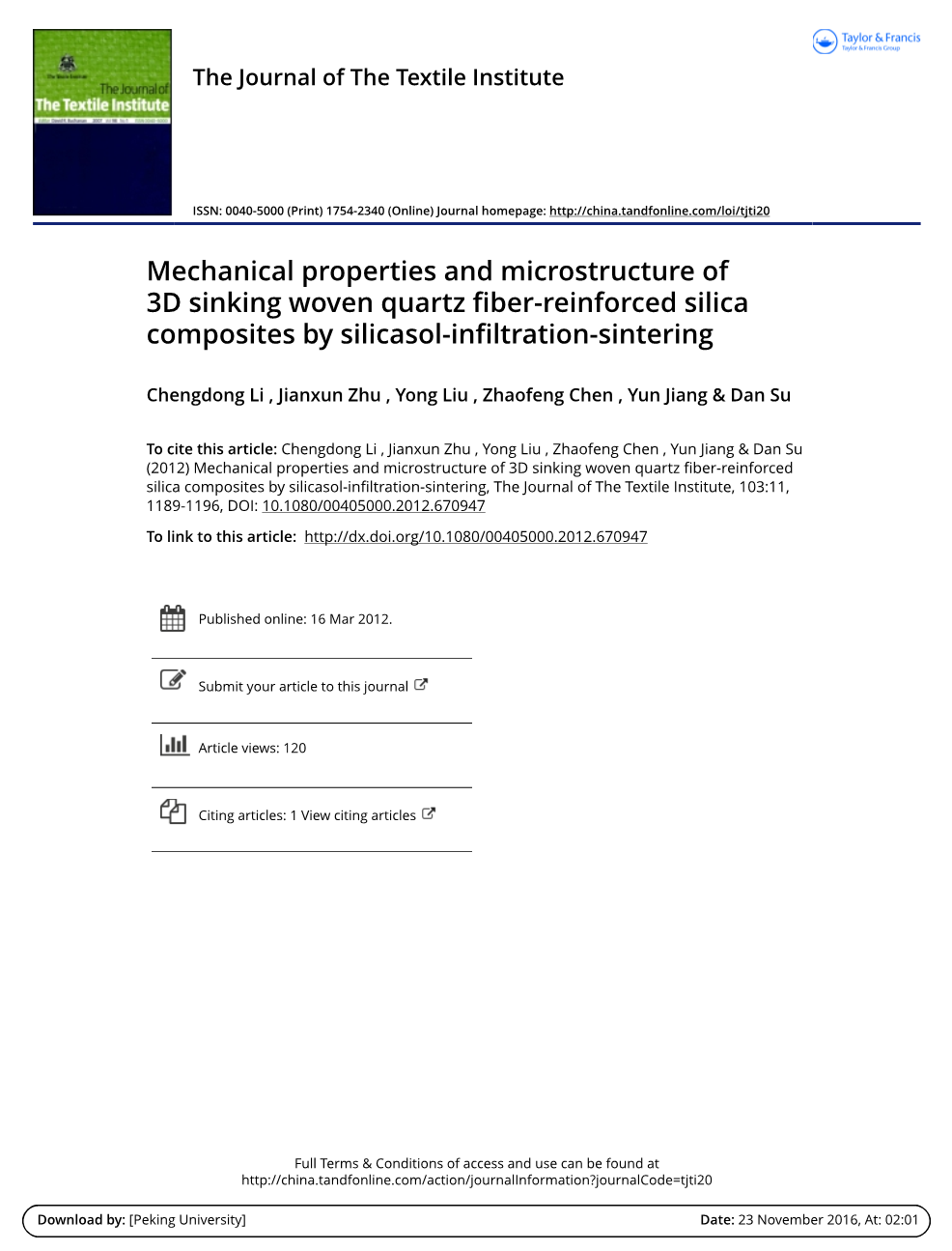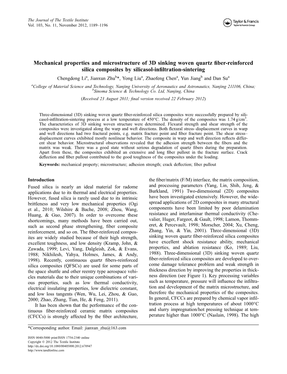已经表明,连续纤维增强陶瓷基复合材料(CFCC)的性能受纤维结构、纤维/基体(F / M)界面、基体组成和工艺参数的强烈影响(Yang,Lin, Shih,Jeng,&Burkland,1991)。二维(2D)复合材料已被广泛研究。然而,二维复合材料在许多结构部件中的广泛应用受到较差的抗分层性和层间导热性的限制(Chevalier,Huger,Fargeot,&Gault,1998; Lamon,Thommeret,&Percevault,1998; Morscher,2004; Xu, Cheng,Zhang,Yin,&Yin,2001)。三维(3D)编织石英纤维增强二氧化硅复合材料具有优异的抗冲击能力,机械性能和抗烧蚀性(Ko,1989; Liu,1988)。通过改善厚度方向的性能(参见图1),开发了三维(3D)编织石英纤维增强二氧化硅复合材料,以克服损伤容限问题和厚度方向强度薄弱的问题。关键的加工变量如温度、压力将影响基体微观结构的渗透和发展,从而影响复合材料的力学性能。一般来说,通过化学气相渗透法在约1000℃的高温下和在高于1000℃的温度下的浆料浸渍/热压技术(Naslain,1998)制备CFCC。高温工艺会导致石英纤维的严重退化,因此,将基体密集包装到石英纤维预制体中以获得高强度复合材料是困难的(Qi,Zhang,&Hu,2006)。然而,硅溶胶-渗透-烧结法(SIS)由于其在450℃的低致密化温度下能够有效地降低收缩率和干燥应力而可能成为最具前景的制备CFCC的工艺(Liu&Huang,2001)。本文采用SIS工艺制备了三维(3D)编织石英纤维增强石英复合材料。研究了复合材料的力学性能和显微结构。