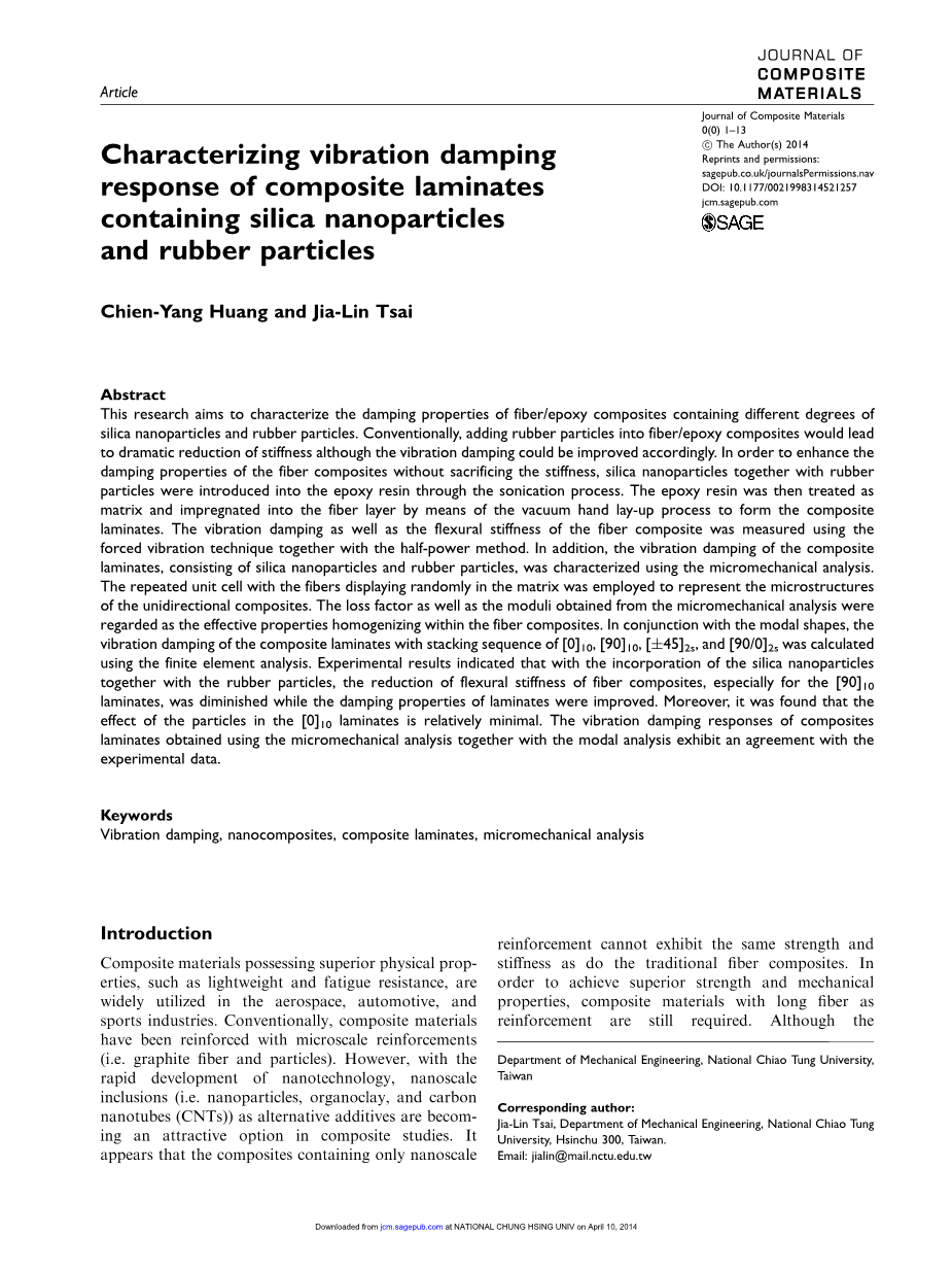 在过去,聚合物中通常采用橡胶颗粒以通过颗粒的大变形以及空化的形成来提高粘弹性。但缺点是橡胶颗粒的加入会明显减少复合材料的刚性。十多年前,人们发现碳纳米管和碳纳米管(碳纳米管)可以有效提高聚合复合材料的阻尼性能。这项探索创造了在复合材料的阻尼性能改进的一个新方向。一些研究人员遵循同样的轨迹通过引入碳纳米管在纤维复合材料增强纤维复合材料的振动阻尼。Khan等人研究含有多壁碳纳米管的纳米复合材料和碳纤维增强聚合物基复合材料的振动阻尼性能(CFRP)。结果表明,纳米复合材料和碳纤维复合材料的损耗模量随着多壁碳纳米管含量的增加而增加。约翰逊等人介绍了碳纳米管对复合材料阻尼性能的改性。结果表明,碳纳米管的加入提高了刚性和特定的阻尼复合材料性能。导致阻尼性能提高的根本原因是碳纳米管与周围聚合物的比接触面积增大。Jang等人探讨掺入石墨化碳纳米纤维(CNF)和二氧化硅(SiO2)颗粒的复合环氧树脂复合材料的力学和热性能。发现添加3wt%SiO2和3wt%CNF的样品可以将损耗因子提高至15%。此外,具有相同颗粒物含量的样品的热稳定性也提高了约15%。除CNT外,还发现纳米二氧化硅纳米粒子的引入可以有效地提高纳米复合材料的阻尼性能。这种增强现象是由于交联密度低以及由纳米粒子引起的塑化效应环氧与在二氧化硅表面上接枝的官能团的化学反应。然而,二氧化硅纳米颗粒对纤维复合材料以及复合材料层合板的振动阻尼的影响在文献中没有进一步探讨。在这项研究中,研究了纤维增强复合材料与二氧化硅纳米粒子和橡胶粒子结合时的阻尼性能和弯曲刚度。使用强制振动技术和半功率法测量纤维复合材料的振动阻尼。此外,材料系统的弯曲刚度从振动测试中测得的共振频率进行评估。此外,使用有限元方法(FEM),对与不同颗粒含量相关的复合层压板的振动阻尼响应进行了表征。模型预测与实验数据进行比较。然后讨论了二氧化硅纳米粒子和橡胶粒子对复合材料层合板振动阻尼的影响。