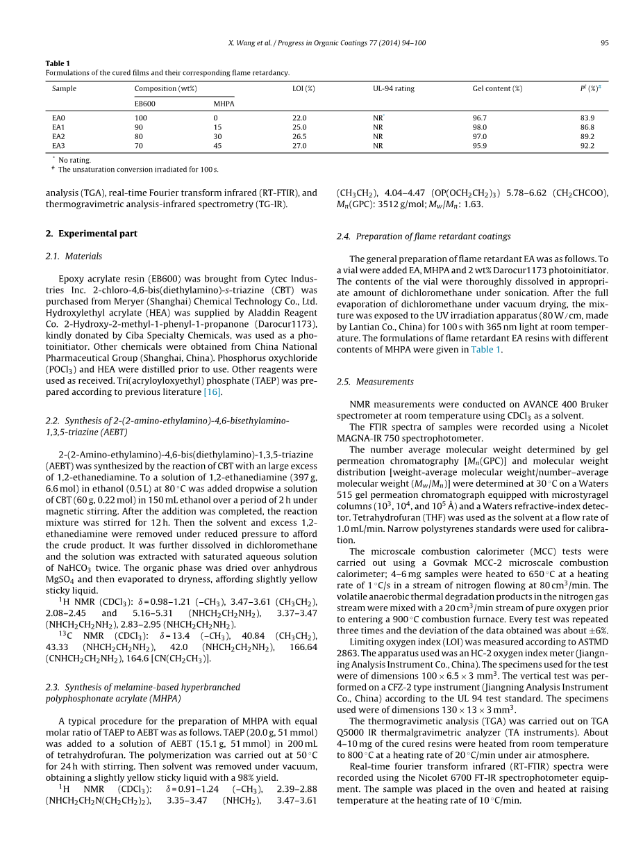 阻燃剂EA的制备如下。 向小瓶中加入EA、MHPA和2wt%Darocur1173光引发剂。在超声下将小瓶内的物质充分溶解在适量的二氯甲烷中。真空干燥下二氯甲烷完全蒸发后,在室温下将混合物置于紫外线照射装置(80W/cm,由Lantian Co.,中国制造)中用365nm光照射100秒。表1给出了具有不同MHPA含量的阻燃EA树脂的配方。