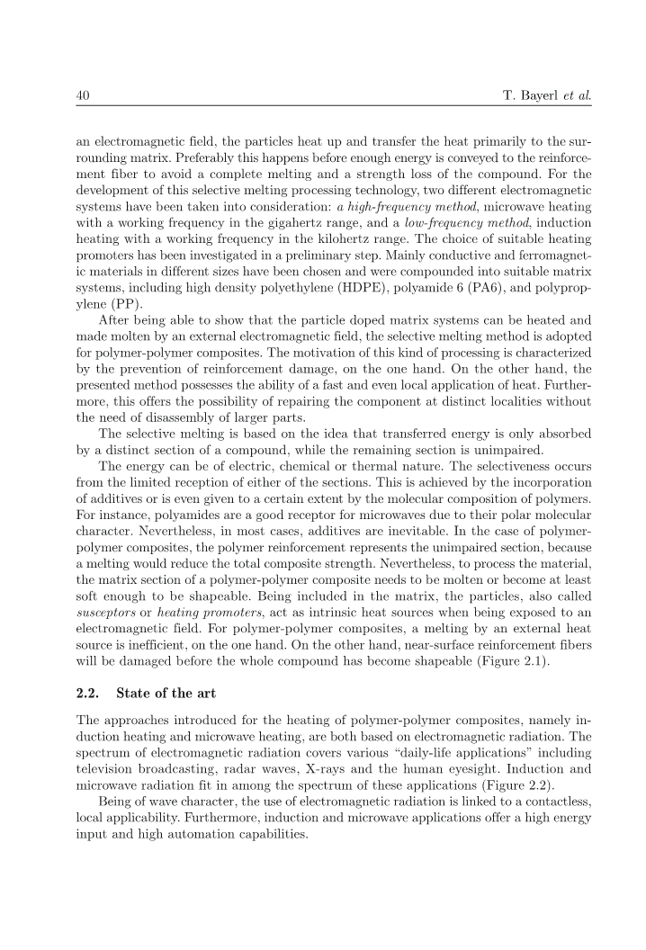 在表明掺杂粒子的基体体系可以通过外加电磁场加热熔融后,选择性熔融法被采用去制备聚合物复合材料。一方面,这种处理方法可以防止增强破坏. 另一方面,该方法也具有快速甚至局部应用热量的能力。此外,它还有在不同地点修理部件而不需要拆卸较大部件的可能性存在。