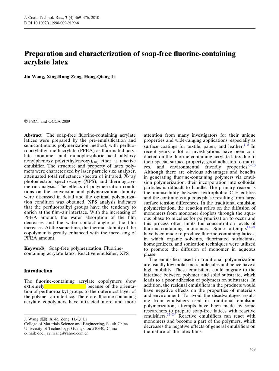 关键词:无皂聚合 含氟 丙烯酸酯乳液 反应性乳化剂 XPS