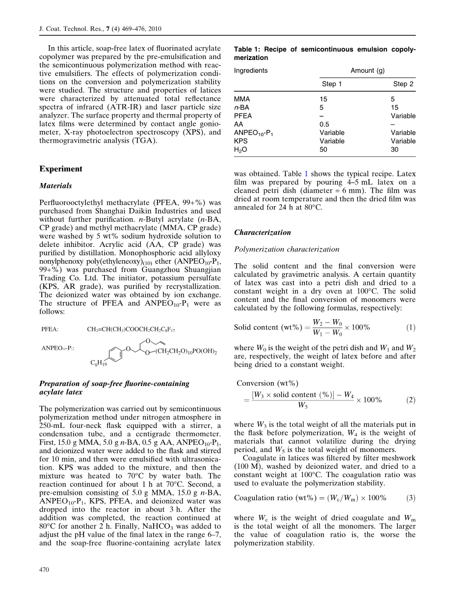 通过在装有搅拌器、冷凝管和摄氏温度计的250毫升四颈烧瓶中的氮气氛下的半连续聚合方法进行聚合。首先,向烧瓶中加入15.0 g MMA、5.0 g n - BA、0.5 g AA、ANPEO10 – P1和去离子水,并搅拌10分钟,然后用超声处理乳化。将KPS加入到混合物中,然后通过水浴将混合物加热至70C°。反应在70C°持续约1h。然后,在约3小时内,将由5.0 g MMA、15.0 g n-BA、ANPEO10-P1、KPS、PFEA、去离子水组成的预乳剂放入反应堆中。添加完成后,反应继续在80C°再进行2小时。最后添加NaHCO3,调整乳液的pH值在6-7这一范围,获得无皂含氟丙烯酸酯乳液。表1示出典型的配方。用4-5毫升乳胶在洗净的培养皿上(直径= 6毫米)制备乳胶膜。薄膜在室温下晾干,然后在80C°的室温下退火。
