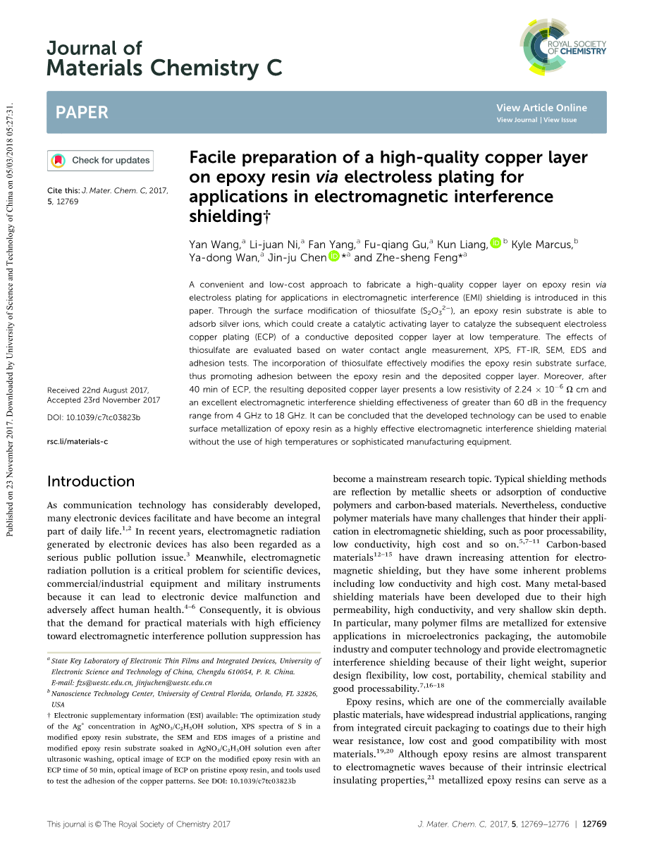 在电磁干扰屏蔽中应用化学镀在环氧树脂上制备高质量铜层的研究