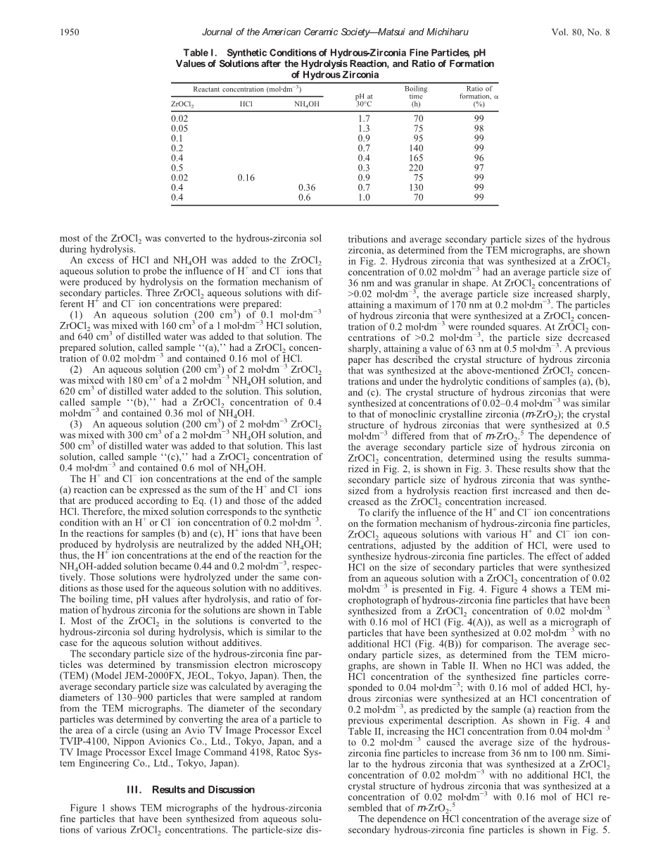 使用透射电镜(Model JEM-2000FX,JEOL,Tokyo,Japan)测量水合氧化锆微粒的二次粒子的粒径。然后随机从透射电镜显微照片中选取130至900微粒作为试样,取其平均值作为二次粒子的平均粒径。将区域由质点转换成圆计算二次粒子的粒径(使用Avio电视图片处理器Excel TVIP-4100.Nippon Avionics Co,Ltd,Tokyo,Japan,电视图像处理器4198图片命令,Ratoc System Engineering Co,Ltd,Tokyo,Japan)。