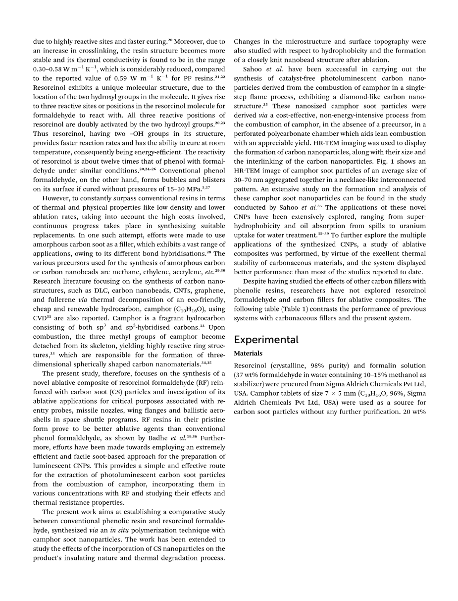 因此,本研究主要集中在合成一种新型的用炭黑(CS)颗粒增强的间苯二酚甲醛(RF)复合材料,并研究其与再入探针,导弹喷嘴,翼状和航天飞机计划中的弹道气球。如Badhe等人所示,原始形式的RF树脂被证明是比常规酚醛树脂更好的烧蚀剂。此外,已经努力采用非常有效和简便的基于烟灰的方法来制备发光CNPs。这为从樟脑燃烧中提取光致发光碳烟颗粒提供了一种简单而有效的途径,将它们以各种浓度与RF结合并研究其效果和耐热性能。