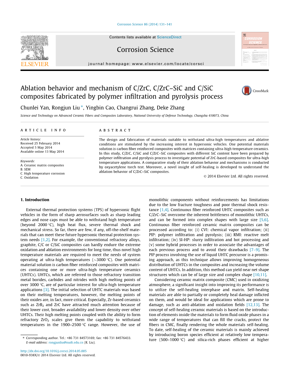 能够承受超高温度和烧蚀条件的材料的设计和制造正在超音速汽车领域产生越来越浓厚的兴趣,一个潜在的解决方案是以碳纤维为增强体,以含有耐超高温度陶瓷的材料为基体的复合材料。在本次研究中,制备出以SiC含量为变量的C/ZrC, C/ZrC–SiC 和 C/SiC高分子复合材料并通过其热分解过程考察SiC基复合材料的耐超高温性能。它们的热分解行为、机理的对比研究用氧乙炔炬测试完成。此外,已发展出新的自愈理论来了解SiC复合材料的烧蚀行为。