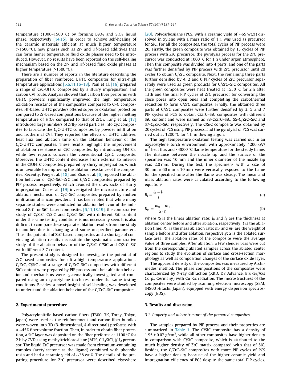 有许多的报告文献中描述了纤维增强UHTC超高温度下应用的复合材料的制备方法。Paul通过 悬浮法预浸工艺和前驱体浸渍裂解制取了一系列的C/C-UHTC复合材料。分析表明,碳纤维与UHTC粉末预成形与C-C复合材料相比显著提高了复合材料的高温抗氧化性能, 铪基超高温陶瓷材料比锆基材料的抗高温氧化性能更好,因为HfO2的熔化温度比ZrO2更高。Tang通过粉末渗透和前驱体浸渍裂解向C-C复合材料中引入了大量的ZrB2基颗粒,他们记录超高温陶瓷,热流,分解时间对C/C-UHTC复合材料热分解行为的影响,结果证实了引入超高温陶瓷对C/C复合材料抗热分解的改善作用,而传统的C/SiC复合材料则表现不佳。此外,tang还发现用并不适合于改善复合材料抗烧蚀性的悬浮法预浸工艺制取的样品中填料的分布从外至内依次减少。最近,feng和zhao研究了通过化学气相渗透法制取的C/C–SiC–ZrC和C/ZrC复合材料的抗烧蚀性能,这一方法避免了悬浮法预浸工艺的缺点。Cui调查了通过硅粉反应性熔体渗透法制取的C/C–SiC复合材料的微观结构和烧蚀机理。已经指出,虽然有许多关于ZrC或碳化硅基复合材料的烧蚀行为的独立研究,以碳化硅含量为变量的C/ZrC, C/SiC 和C/ZrC–SiC基复合材料在相同测试条件下的研究是十分必要的。由于改变的或未详细说明的某些参数条件,比较这些单独性研究的烧蚀结果也是不可行的。因此,ZrC基复合材料的潜能及烧蚀数据的缺乏使得不同含量的碳化硅的C/ZrC, C/SiC and C/ZrC–SiC基复合材料的对比性烧蚀试验成为必须。目前的研究主要是调查ZrC基复合材料在超高温领域的潜能,不同碳化硅含量的C/ZrC, C/SiC和一系列C/ZrC–SiC复合材料通过前驱体浸渍裂解法制取出来并在相同测试条件下系统的调查和对比了它们的烧蚀行为和机理。并且,发展出一种全新的观点来解释C/ZrC–SiC复合材料的烧蚀行为。