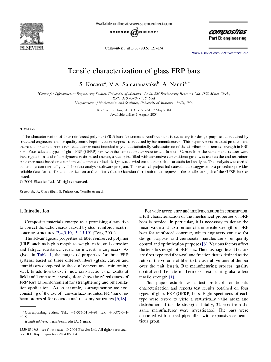 摘要:对于结构工程师的设计目的以及棒材制造商要求的质量控制/优化目的来说用于混凝土加固的纤维增强聚合物(FRP)棒的表征是必要的。本文报告了一个测试协议从复制实验获得的结果旨在说明关于FRP棒材拉伸强度分布的统计学有效估计。测试了四种选择类型的具有相同直径的玻璃FRP(GFRP)棒,总共调查来自同一个制造商32个棒材。代替聚合物树脂基锚固件,使用填充有膨胀水泥质浆料的钢管作为端部限制器。该实验进行基于随机完全区块设计来获得统计分析数据,使用商用的数据分析软件程序进行分析。该研究项目表明,该测试程序提供可靠的数据用于拉伸性能表征和确定高斯分布,可以表示GFRP条的拉伸强度测试。