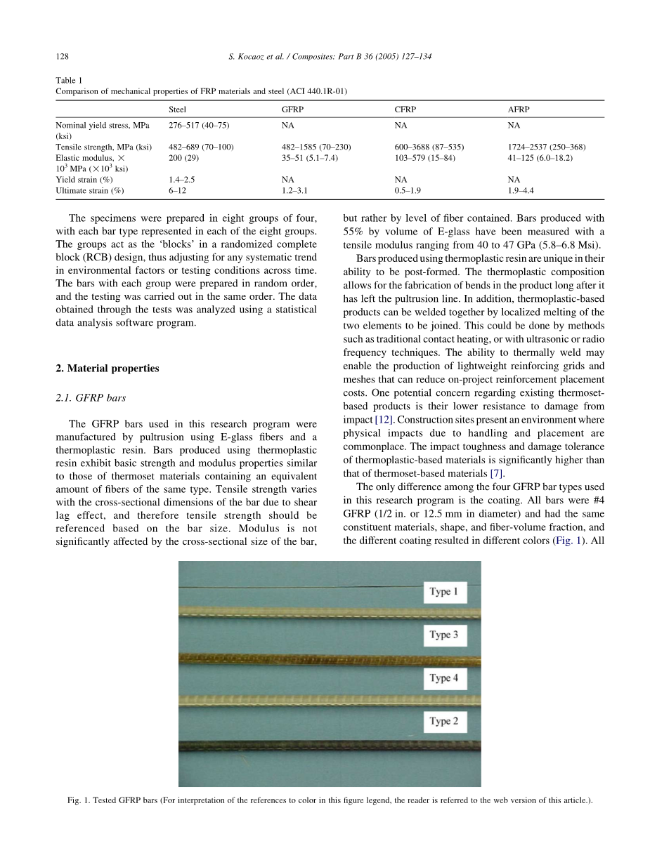 使用热塑性树脂生产的棒材具有独特的后期成型能力。热塑性复合材料允许在产品离开拉挤线之后弯曲。另外,以热塑性为主产品可以通过局部熔化焊接使两个构件连接在一起。这可以通过下列的方法来完成,例如传统的接触式加热,或超声波或无线电频率技术。热焊接的可能性能够生产轻质加强网格和可以减少项目上的钢筋位置的网格成本。 一个潜在的关注现有的热固性产品具有较低的耐受性[12]。 施工现场由于处理和放置而产生的物理冲击很平常, 热塑性材料的冲击韧性和耐磨性显着高于热固性材料[7]。所有的四种类型的棒材都是由矩阵中的刚性的热塑性聚氨酯构成的E玻璃纤维所组成。 如上所述,所有的样品唯一的区别是涂层,这是防止碱侵蚀的关键因素。