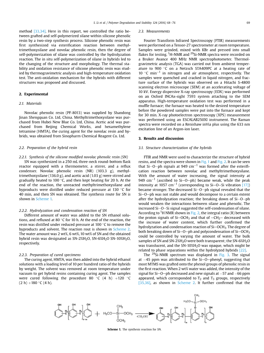 为了获得不同的相结构,控制硅烷在酚醛树脂中的聚合度可能是一种有效的方法[33,34]。在本报告中,我们采用两步法控制硅酮酚醛树脂中接枝硅烷和自聚合硅烷的比例。首先通过甲基三甲氧基硅烷与酚醛树脂的酯化反应合成硅酮酚醛树脂,然后通过水解反应控制硅烷的自聚合程度。杂化物中硅烷的原位自聚合使杂化体的结构和形貌发生变化。通过热重分析和高温氧化试验,研究了有机硅酚醛树脂的热稳定性和抗氧化性能,提出并讨论了不同结构杂化剂的抗氧化机理。