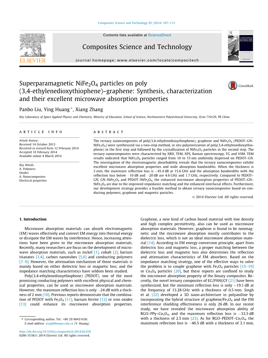 ternary nanocomposites were characterized by XRD, TEM, XPS, Raman spectroscopy, TG and VSM. TEM results indicated that NiFe2O4 particles ranged from 10 to 15 nm uniformly dispersed on PEDOT–GN. The investigation of the electromagnetic absorbability reveals that the ternary nanocomposites exhibit excellent microwave absorption properties and wide absorption bandwidths. When the thickness is 2 mm, the maximum reflection loss is 45.4 dB at 15.6 GHz and the absorption bandwidths with the reflection loss below 10 dB and 20 dB are 4.6 GHz and 1.7 GHz, respectively. Compared to PEDOT–GN, GN–NiFe2O4 and PEDOT–NiFe2O4, the enhanced microwave absorption properties of PEDOT–GN–NiFe2O4 are due to the improved impedance matching and the enhanced interfacial effects. Furthermore,