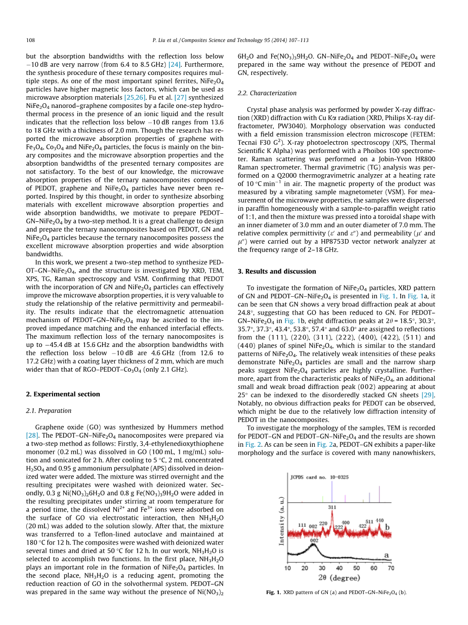 Microwave absorption materials can absorb electromagnetic(EM) waves effectively and convert EM energy into thermal energy or dissipate the EM waves by interference. Hence, increasing attentions have been given to the microwave absorption materials. Recently, many researchers are focus on the development of microwave absorption materials, such as nickel [1], cobalt [2], barium titanates [3,4], carbon nanotubes [5,6] and conducting polymers [7–9]. However, the attenuation mechanism of those materials is mainly based on either dielectric loss or magnetic loss, and the impedance matching characteristics have seldom been studied. Poly(3,4-ethylenedioxythiophene) (PEDOT), one of the most promising conducting polymers with excellent physical and chemical properties, can be used as microwave absorption materials. However, the maximum reflection loss is only 24 dB with a thickness of 2 mm[10]. Previous reports demonstrate that the combination of PEDOT with Fe3O4 [11], barium ferrite [12] or iron oxides [13] could enhance its microwave absorption properties. Graphene, a new kind of carbon based material with low density and high complex permittivity, also can be used as microwave absorption materials. However, graphene is found to be nonmagnetic and the microwave absorption mostly contributes to the dielectric loss, which is not an ideal microwave absorption material[14]. According to EM energy conversion principle, apart from dielectric loss and magnetic loss, a proper matching between the dielectric loss and magnetic loss also determines the reflection and attenuation characteristics of EM absorbers. Based on the impedance matching strategy, one of the effective ways to solve the problem is to couple graphene with Fe3O4 particles [15–19] or Co3O4 particles [20], but these reports are confined to study the microwave absorption property of the binary composites. Recently, the novel ternary composites of EG/PANI/CF [21] have been synthesized, but the minimum reflection loss is only 19.1 dB at the frequency of 13.28 GHz with a thickness of 0.5 mm. Singh et al. [22] developed a 3D nano-architecture in polyaniline by incorporating the hybrid structure of graphene/Fe3O4 and the EM interference shielding effectiveness is only 26 dB. In our recent study, we have revealed the microwave absorption ability of RGO–PPy–Co3O4, and the maximum reflection loss is -33.5 dB with a thickness of 2.5 mm [23]. As for RGO–PEDOT–Co3O4, the maximum reflection loss is -46.5 dB with a thickness of 3.1 mm,but the absorption bandwidths with the reflection loss below -10 dB are very narrow (from 6.4 to 8.5 GHz) [24]. Furthermore, the synthesis procedure of these ternary composites requires multiple steps. As one of the most important spinel ferrites, NiFe2O4 particles have higher magnetic loss factors, which can be used as microwave absorption materials [25,26]. Fu et al. [27] synthesized NiFe2O4 nanorod–graphene composites by a facile one-step hydrothermal process in the presence of an ionic liquid and the result indicates that the reflection loss below -10 dB ranges from 13.6 to 18 GHz with a thickness of 2.0 mm. Though the research has reported the microwave absorption properties of graphene with Fe3O4, Co3O4 and NiFe2O4 particles, the focus is mainly on the binary composites and the microwave absorption properties and the absorption bandwidths of the presented ternary composites are not satisfactory. To the best of our knowledge, the microwave absorption properties of the ternary nanocomposites composed of PEDOT, graphene