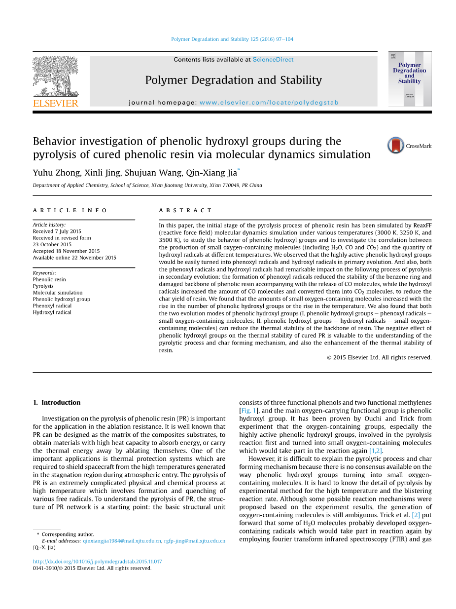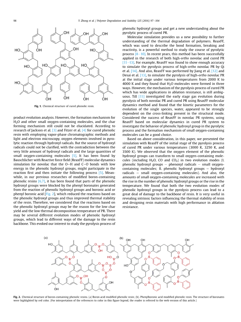 本文利用反应力场 (ReaxFF) 分子动力学模拟在不同温度(3000 K, 3250 K, 3500 K)酚醛树脂热解过程的初始阶段,研究酚羟基的行为和并研究小含氧分子(包括H2O,CO和CO2的生成之间的相关性)和不同温度下的羟基自由基的数量。我们观察到,在初级转换过程中,高活性的酚羟基很容易转化为苯氧基和羟基自由基。同时,苯氧基和羟基自由基在二次转换过程中对以下热解过程有显著影响: 苯氧基的形成降低了其稳定性,并伴随着CO分子的释放而损坏了酚醛树脂的骨架,而羟基自由基增加了CO分子的数量并将它们转化为CO2分子,以减少树脂的焦炭产量。我们发现,随着酚羟基数量的增加或温度的升高,含氧小分子的量增加。我们还发现,酚羟基的两种转换模式(I.酚羟基 - 苯氧基自由基 -含氧小分子; II.酚羟基 - 羟基自由基 - 小的含氧分子)都会降低其热稳定性。酚羟基对固化PR热稳定性的负面影响,对了解热解过程和炭的形成机理,提高树脂的热稳定性具有重要意义。