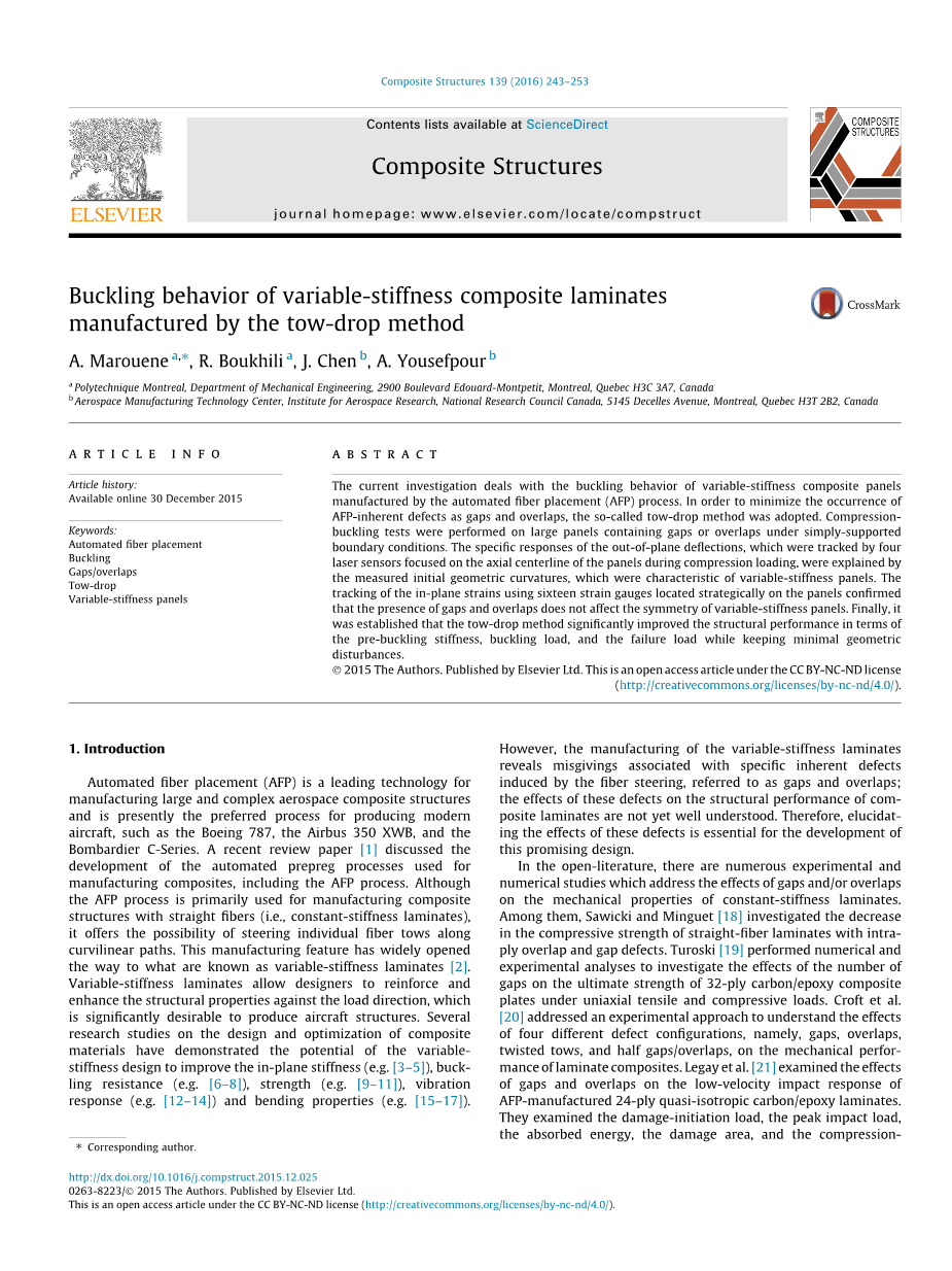 自动铺丝技术是制造大型复杂航空航天复合材料结构的领先技术,目前是生产现代飞机的首选工艺,如波音787、空客350XWB和庞巴迪C系列。最近的一篇评论论文[1]讨论了用于制造复合材料的自动预浸料工艺的发展,包括自动铺丝技术工艺。虽然自动铺丝技术工艺主要用于制造具有直纤维(即恒刚度层压板)的复合材料结构,但它提供了沿曲线路径引导单个纤维管的可能性。这种制造特性为所谓的变刚度层压板[2]开辟了广泛的道路。可变刚度层压板使设计人员能够根据载荷方向加固和增强结构性能,这对于生产飞机结构是非常可取的。关于复合材料设计和优化的几项研究表明,可变性设计在提高平面内刚度([3–5])、屈曲阻力([6–8])、强度([9-11])、振动方面具有潜力。响应([12–14])和弯曲特性([15–17])。然而,变刚度层压板的制造显示了与纤维转向引起的特定固有缺陷相关的疑虑,称为间隙和重叠;这些缺陷对复合材料层压板结构性能的影响尚不清楚。因此,阐明这些缺陷的影响对于这一有希望的设计的发展至关重要。