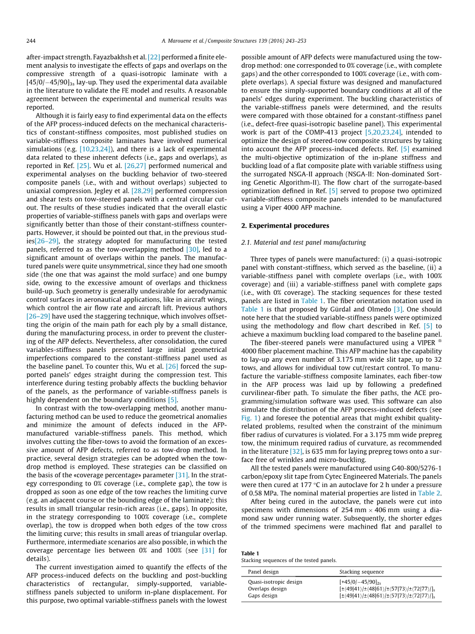 目前的研究旨在量化自动铺丝技术过程引起的缺陷对矩形、简支、可变板在均匀平面位移下的屈曲和后屈曲特性的影响。为此,使用拖放法制造了两个可能数量为自动铺丝技术缺陷的最佳可变刚度面板:一个对应于0%的覆盖率(即完全间隙),另一个对应于100%的覆盖率(即,具有完全重叠)。设计制造了一种特殊的夹具,以确保在实验过程中所有面板边缘都有简单支撑的边界条件。确定了变刚度板的屈曲特性,并与恒刚度面板(即无缺陷准各向同性基线板)的结果进行了比较。本实验工作是COMP-413项目[5、20、23、24]的一部分,旨在考虑到自动铺丝技术过程引起的缺陷,优化转向拖复合结构的设计。参考[5]使用代干NSGA-ii方法(NSGA-ii:非主导排序遗传算法),研究了变刚度平板平面内刚度和屈曲载荷的多目标优化。参考[5]中定义的基于代理的优化流程图提出了两个优化的变刚度复合板,打算使用Viper 4000自动铺丝技术机制造。