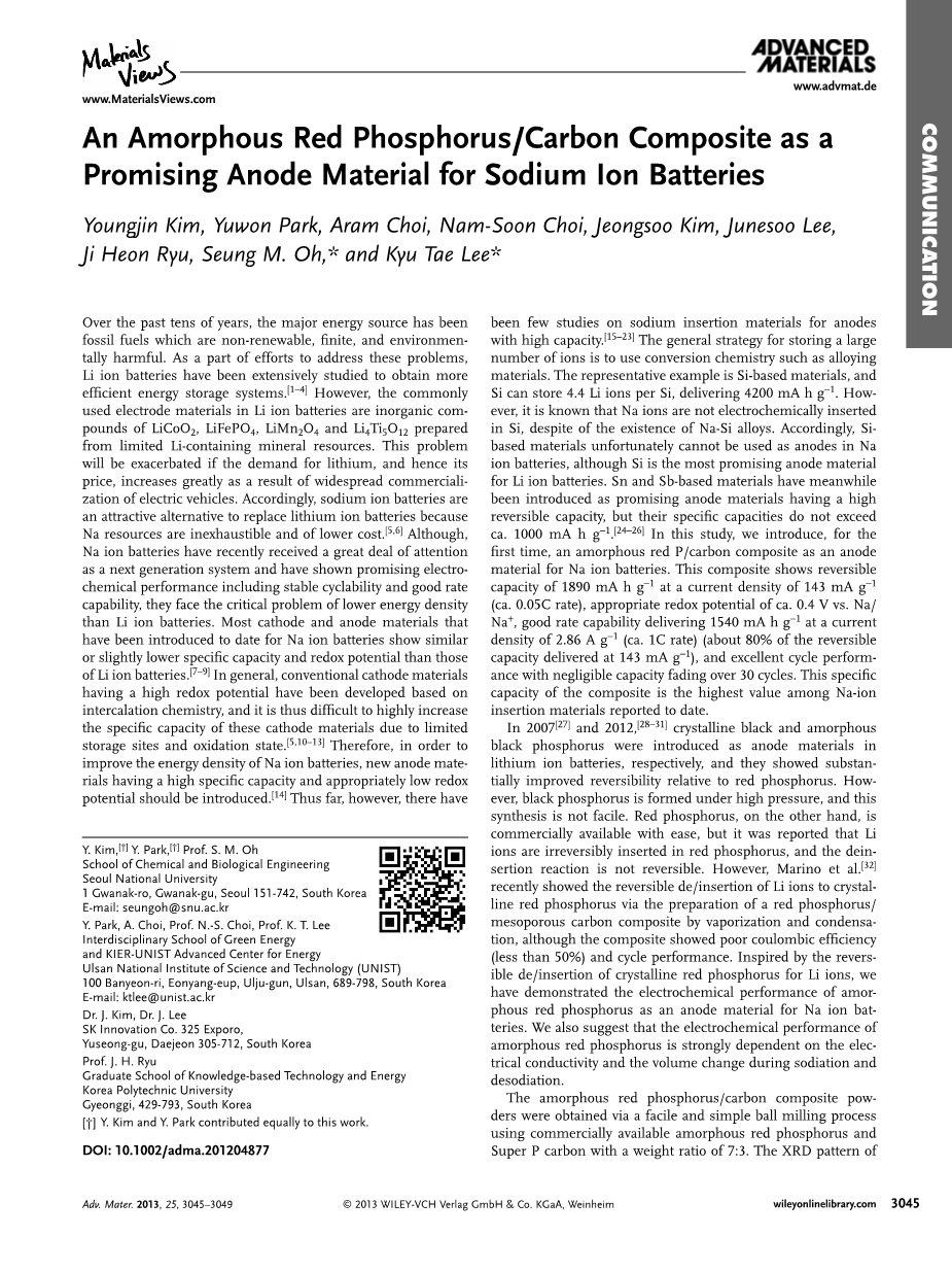 Youngjin Kim , Yuwon Park , Aram Choi , Nam-Soon Choi ,Jeongsoo Kim , Junesoo Lee ,Ji Heon Ryu , Seung M. Oh , * and Kyu Tae Lee *