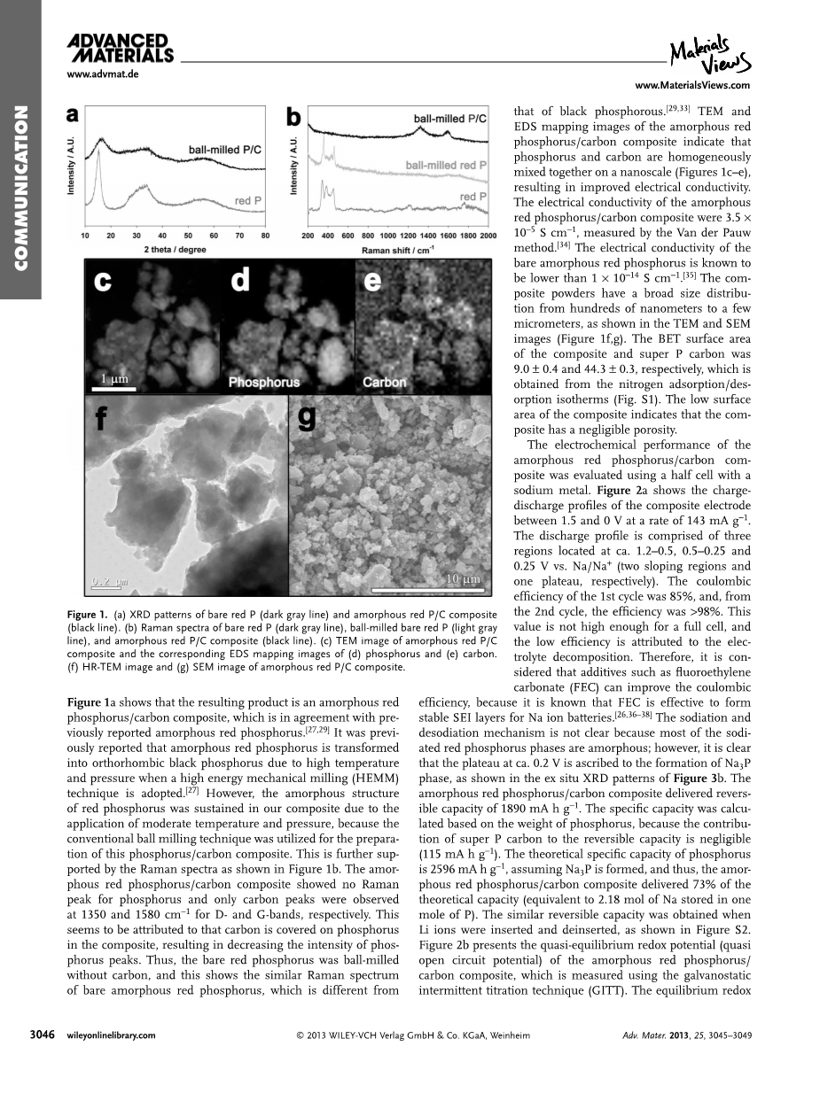 在2007和2012年人们的研究中,晶型的黑磷和无定形的黑磷都曾作为锂离子电池的负极材料,它们所展现出的可逆容量要好于红磷。但是,黑磷需要在高压下才能形成,这个合成过程的反应条件并不温和。在另一方面,红磷是很容易获得的,但是据报道锂离子嵌入红磷是不可逆的,其脱嵌也是不可逆的。但是Marino等人证明锂离子能够可逆嵌入和脱嵌于红磷中,这种红磷是通过红磷/介孔碳复合材料通过蒸发冷凝方法来合成,虽然这种复合材料展现了较差的库伦效率(低于50%)和循环性能。受到锂离子能够可逆的嵌入和脱嵌于红磷的启发,我们已经进行了无定形红磷作为钠离子电池的负极材料的电化学性能的测试实验,实验表明无定形红磷的电化学性能大部分取决于其导电性和在嵌入和脱嵌过程中的体积膨胀。