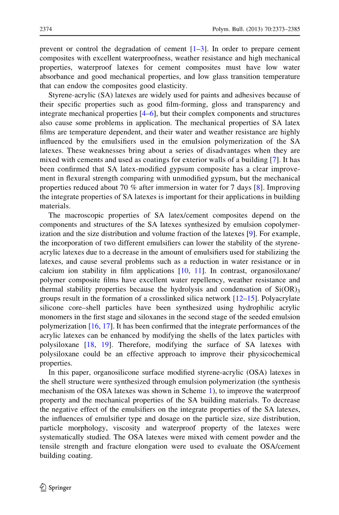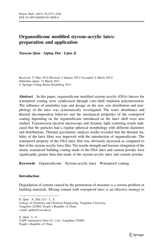 苯乙烯 - 丙烯酸(苯乙烯-丙烯酸)乳液因其特殊的性能,如良好的成膜性,光泽度和透明度以及整合的机械性能而广泛应用于油漆和粘合剂的工业生产之中,但它们复杂的组分和结构也会在应用中引起一些问题。苯乙烯 - 丙烯酸胶乳薄膜的机械性能是具有温度依赖性的,并且它们的耐水性和耐候性受到苯乙烯 - 丙烯酸乳胶的乳液聚合中使用的乳化剂的影响。当这些缺点与水泥混合,并用作建筑物的外墙涂料时,会带来一系列的缺点。已经证实苯乙烯 - 丙烯酸乳胶改性石膏复合材料与未修饰的石膏相比明显改善了抗弯强度,但是在水中浸泡了7天之后,机械性能却降低了大约70%。所以说,想办法提高苯乙烯 - 丙烯酸胶乳的完整性对于它们在建筑材料中的应用非常重要。苯乙烯 - 丙烯酸胶乳/水泥复合材料的宏观性能取决于乳液共聚合成的苯乙烯 - 丙烯酸胶乳的组成和结构,以及胶乳的粒度分布和体积分数。例如,由于用于稳定胶乳的乳化剂的量减少,加入两种不同的乳化剂会降低苯乙烯-丙烯酸酯的稳定性,并可能导致若干问题。例如:薄膜应用中耐水性或铈离子稳定性的降低.相反,有机硅氧烷/聚合物复合膜具有优异的防水性,耐候性和热稳定性,因为Si(OR)3基团的水解和缩合反应,导致反应体系中形成了交联的二氧化硅网络。通过在第一阶段使用亲水性丙烯酸单体,在种子乳液聚合的第二阶段使用硅氧烷,合成了聚丙烯酸酯硅氧烷核 - 壳颗粒。已经得到了证实,通过用聚硅氧烷改性胶乳颗粒的壳可以增强苯乙烯-丙烯酸胶乳的整合性能。因此,用聚硅氧烷改性苯乙烯 - 丙烯酸胶乳的表面可能是改善丙烯酸乳胶的物理化学性质的一种有效方法。