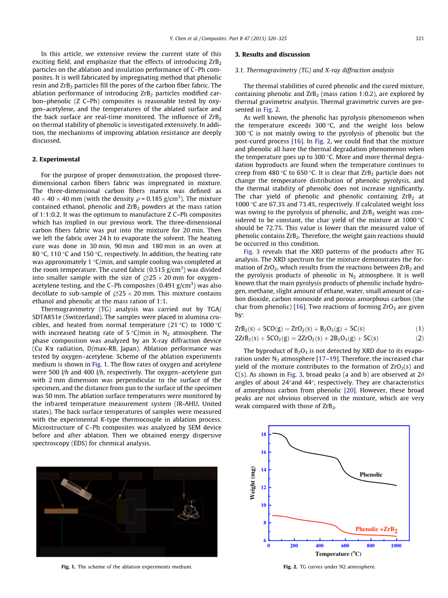 摘要:引入ZrB2粒子的碳/酚醛复合材料制作精良,可以满足热防护系统的需求。热重分析显示,虽然ZrB2粒子的存在并没有增强酚醛树脂的热稳定性,但它增加了酚醛树脂的残碳率。而且,主要由于ZrO2和B2O3的结构,引入ZrB2粒子的方法显著的提高了碳酚醛复合材料的耐烧蚀性能和绝缘性能。显微结构显示,在碳/酚醛复合材料中,基体的烧蚀率明显的比碳纤维的高。但是,在二硼化锆-碳/酚醛复合材料中,碳纤维与基体的烧蚀率相同。