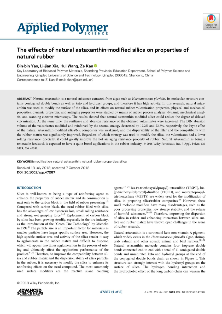 摘要:天然虾青素是从雨生红球藻等藻类中提取的天然物质。其分子结构包含共轭双键以及酮基和羟基,因此具有高活性。本研究采用天然虾青素改性二氧化硅表面,通过橡胶工艺分析仪、动态力学分析仪和扫描电子显微镜,研究其对天然橡胶硫化性能、物理机械性能、动态性能和抗老化性能的影响。结果表明,天然虾青素改性二氧化硅可以降低延迟硫化程度,同时提高了硫化橡胶的回弹性和耐磨性。通过第二种策略改性和增强的硫化胶的DIN磨损体积分别下降了19.2%和23.6%;天然虾青素改性二氧化硅/ NR复合材料的佩恩效应减弱,并且氟化物的分散性和与橡胶基质的相容性得到显著改善。无论使用哪种策略来改性二氧化硅,硫化胶都具有较低的抗滚动性。特别是它可以大大提高橡胶的耐热空气老化性能。天然虾青素作为可再生原料,有望在橡胶工业中有广泛应用。