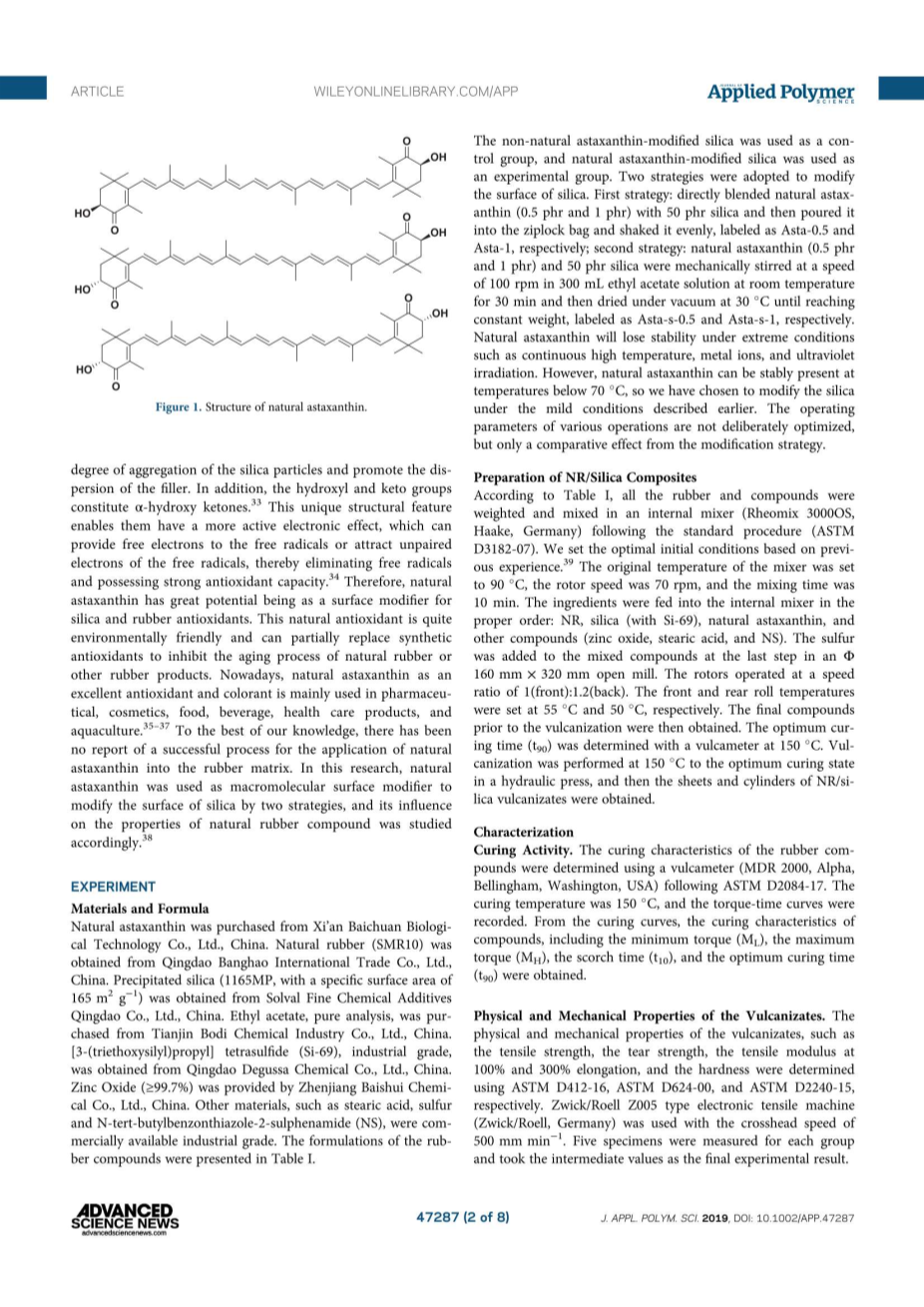 天然虾青素是一种类胡萝卜素酮非维生素A色素,广泛存在于雨生红球藻、虾、蟹、鲑鱼等水生动物和鸟类羽毛中,天然虾青素分子含有4个异戊二烯双键,端对端连接共11个共轭共轭双键链末端的双键和不饱和酮和羟基,如图1所示。该结构可与二氧化硅表面的羟基强烈相互作用。氢键相互作用和长碳链的疏水性膜可以减弱二氧化硅颗粒的聚集程度并促进氟化物的分散。此外,羟基和酮基构成alpha;-羟基酮。这种独特的结构特征使它们具有更活跃的电子效应,可以为自由基提供游离的电子或吸引自由基的非电子,从而消除自由基并具有强大的抗氧化能力。 因此,天然弹性蛋白具有很大的潜力,可作为表面改性剂和橡胶抗氧化剂。这种天然抗氧化剂非常环保,可部分取代合成抗氧化剂,抑制天然橡胶或其他橡胶制品的老化过程。如今,天然虾青素作为一种优良的抗氧化剂和着色剂主要用于制药、化妆品、食品、饮料、保健品和水产养殖等领域。据我们所知,目前还没有关于天然弹性蛋白在橡胶基质中成功应用的报道。本研究中,天然抗生素用作大分子表面改性剂通过两种策略对表面进行改性,并对其天然橡胶化合物的性能进行了相应的研究。