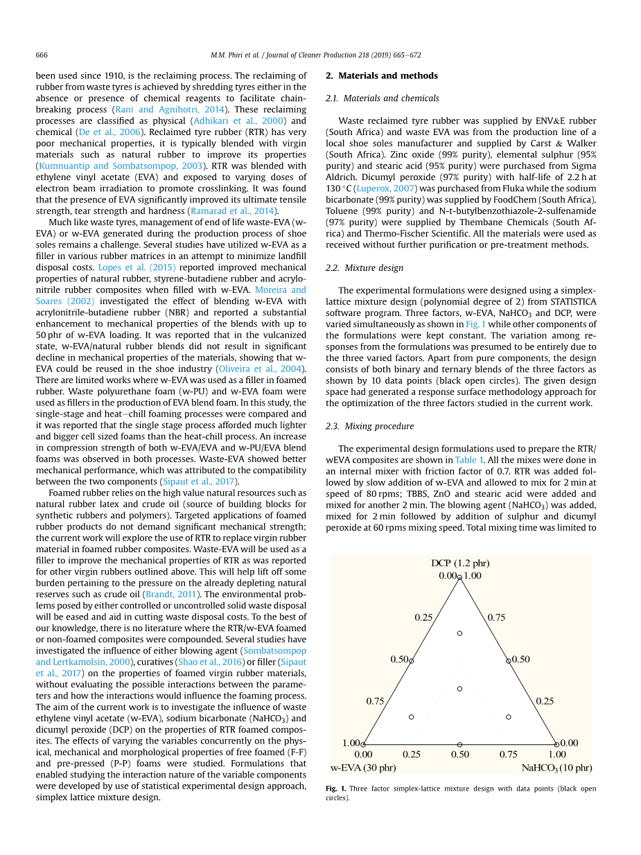 泡沫橡胶依赖于高价值的自然资源,如天然橡胶胶乳和原油(合成橡胶和聚合物的结构单元来源)。泡沫橡胶产品的目标应用不需要显着的机械强度; 目前的工作将探讨使用RTR替代泡沫橡胶复合材料中的原始橡胶材料。废弃物EVA将用作填料以改善RTR的机械性能,如上文概述的其他原始橡胶所报道的。这将有助于缓解原油等已经枯竭资源压力的有关负担(Brandt,2011)。控制或不受控制的固体废物处理所带来的环境问题将得到缓解,并有助于减少废物处理成本。据我们所知,目前还没有关于RTR/w-EVA发泡或非发泡复合材料复合的文献。一些研究调查了发泡剂(Sombatsompop和Lertkamolsin,2000年)、助溶剂(Shao等人,2016年)或填料(Sipaut等人,2017年)对发泡原始橡胶材料性能的影响,但没有评估参数之间可能的相互作用以及相互作用将如何影响发泡性能。目前的工作目的是研究废乙烯醋酸乙烯酯(w-EVA),碳酸氢钠(NaHCO3)和过氧化二异丙苯(DCP)对RTR泡沫复合材料性能的影响。同时改变变量对自由发泡(F-F)和预压(P-P)泡沫的物理,机械和形态特性的影响进行了研究。通过使用统计实验设计方法,单面晶格混合物设计,开发了能够研究可变成分的相互作用性质的配方。