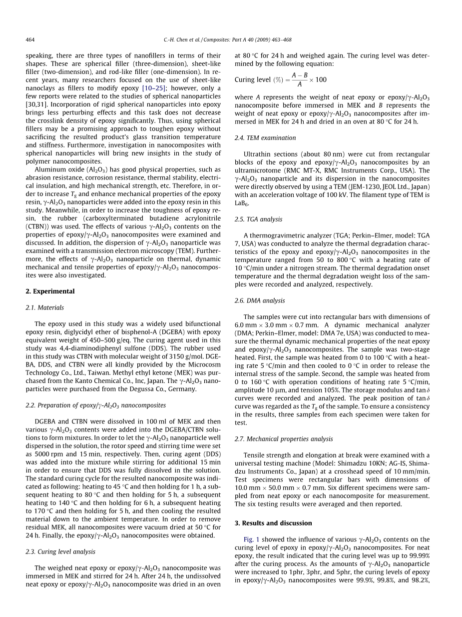 在该研究中使用的环氧树脂是广泛使用的双酚A二缩水甘油醚(DGEBA)双官能环氧树脂,环氧当量为450-500g/eq。本研究中使用的固化剂是4,4-二氨基二苯砜(DDS)。该研究中使用的橡胶是CTBN,分子量为3150g / mol。 DGEBA,DDS和CTBN均由台湾Microcosm Technology 公司提供。甲基乙基酮(MEK)购自日本Kanto Chemical公司。gamma;-Al2O3纳米颗粒购自德国Degussa公司。