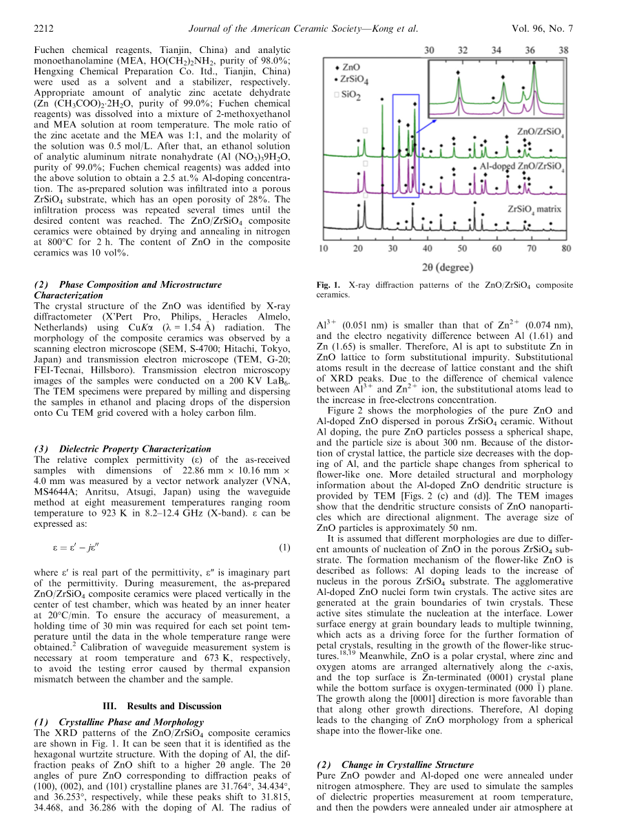 与纯ZnO/ZrSiO4复合陶瓷相比,掺铝ZnO试样在任何温度下的e #39;值均大于纯ZnO试样。铝掺杂导致缺陷的增加和颗粒形貌的改变。从图1所示的XRD图谱可以推断出缺陷的增加。掺铝ZnO的衍射角比纯ZnO大,而界面间距较小。随着界面间距的减小,氧空位减少