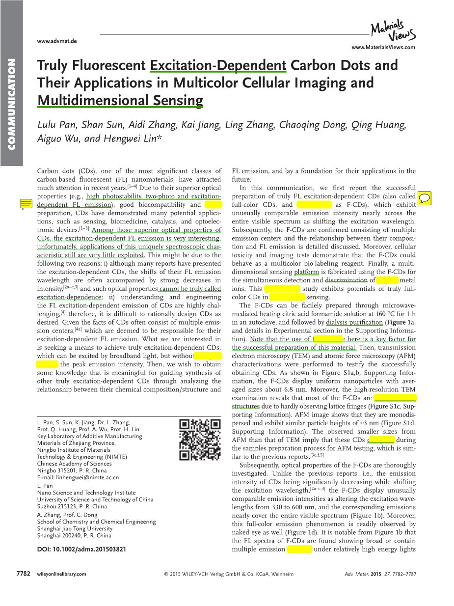 在这篇文章中,我们首次报告了成功制备真正的荧光激发依赖型的CDs(也叫全色域CDs,简称F-CDs),它表现出异常的发射强度,随着激发波长的改变其几乎跨越整个可见光谱。随后,该F-CDs被确认是由多个发射中心组成,并且其成分之间的关系和荧光发射经过了详细的讨论。此外,细胞毒性试验表明,F-CDs能成像表现为一个多色生物标记试剂。最后,F-CDs可用于多维遥感平台用以检测不同金属离子。本研究展现了真正的全色电位CDs在多态遥感领域的应用潜力。。