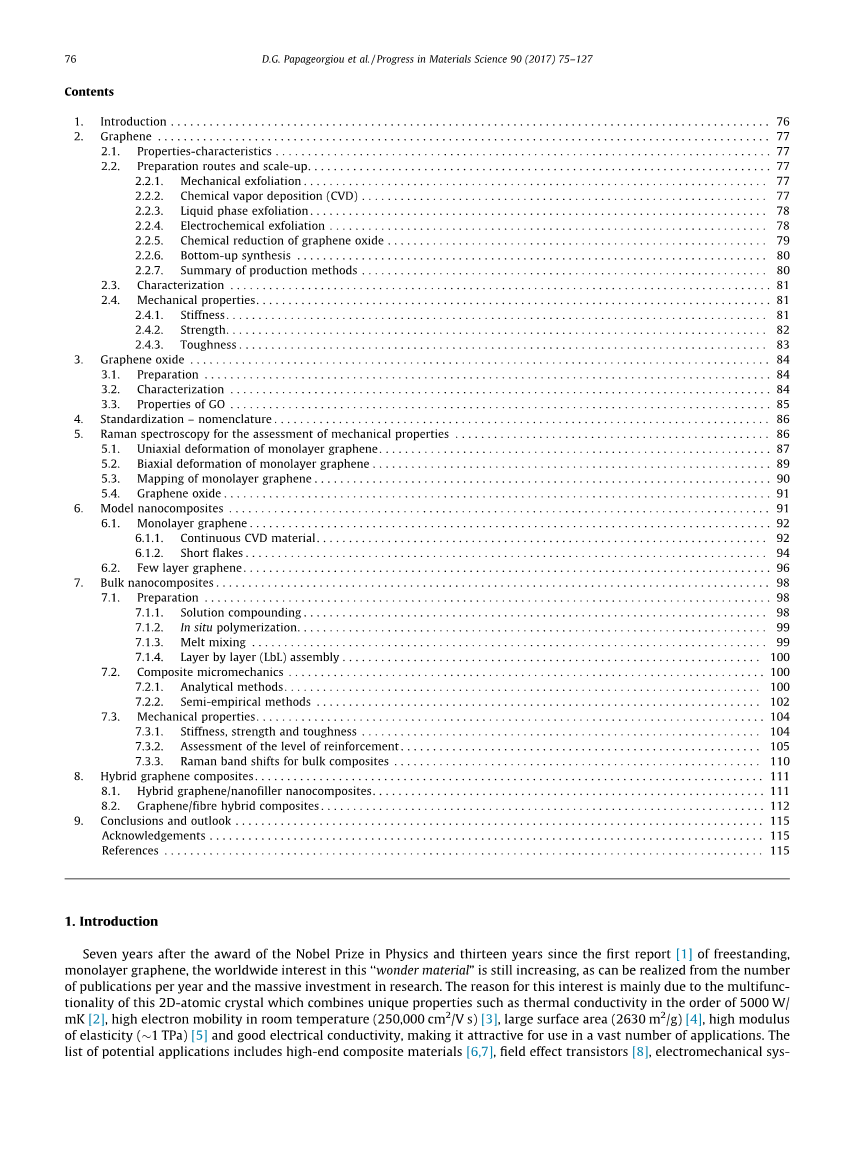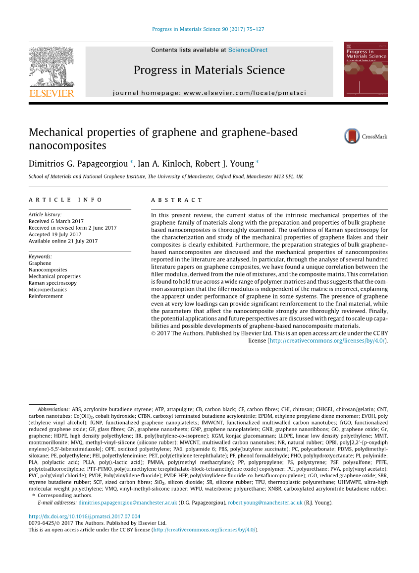 对于石墨烯复合材料的机械性能的研究,在学术和工业中都受到不断的关注,这篇评论来自于我们小组的一份最新的出版物,广泛地处理了石墨烯复合材料力学问题。在原稿的第一主要部分(1-4章)中,针对石墨烯固有的机械性能,包括刚度、强度和韧性,讨论了石墨烯和氧化石墨烯的性能及制备方法,针对每种性能的关键方面,例如起皱、压皱、堆叠、缺陷等都进行了充分的评估。此外,标准化和命名法也是一个同样重要的话题,本文也进行了讨论,甚至在石墨烯成为焦点几年后,在文献中石墨烯基材还经常被错误地分类。原稿的第二主要部分(5章)评价了拉曼光谱在评估石墨烯机械性能中的作用。还介绍了在几篇重要文献中,使用拉曼光谱法、石墨烯膜的单轴向或双轴拉伸和映射的方法来确定石墨烯的机械性能。最后,第三主要部分(6-8章)为综述,总结了最近在石墨烯纳米复合材料方面的研究,对大部分复合材料机械性能的制备方法和影响因素进行了分析。还讨论了对于纳米复合材料同样重要的参数,如石墨烯的取向、系统的微观力学和石墨烯混合物的性能。两个表总结了石墨烯基材料在许多聚合物矩阵中的增强效果。在此基础上,对拉曼光谱转变在大量纳米复合材料中的研究进行了评估。